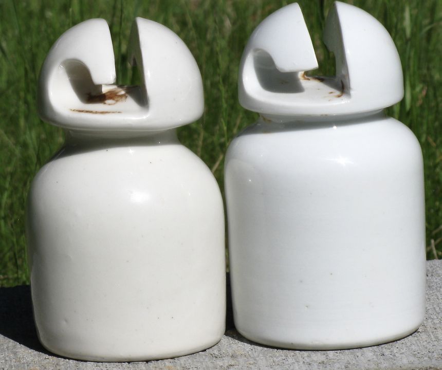 Here's a rare snow white porcelain no-tie insulator (on the right) that most likely originates from France but was used in Spain. Measures 3" x 5 1/4". The color, squared shoulder, and wide claws rule out England (seen on left in the photo in a cream color) and Portugal (which were made with rounded shoulder and brown glaze). The squared shoulder rules out Germany and Spain. The rare marked Spain example (Manufactures Ceramicas) has a rounded shoulder- a totally different mold! I have 2 early French insulator catalogs from the same era as this no-tie (circa 1900-10) and their insulators are primarily squared shoulders with straight skirts and snow white porcelain. Additional evidence is seen in the "Asturies" model no-tie insulator made in France with a squared shoulder [id=713310880]. I am unaware of any other country that has produced a snow white porcelain squared shoulder no-tie. Even if it is later shown not to have been made in France it is still very rare as only 2 examples in this profile are known to exist! The insulator is in VNM condition with small chip on one claw and small flake on the underside of other claw with small wire rub and minor rust in the slot. This example is unlisted in all the books and NIA website! First email gets this rare no-tie insulator for $375 shipped. Price is firm! Thanks! |