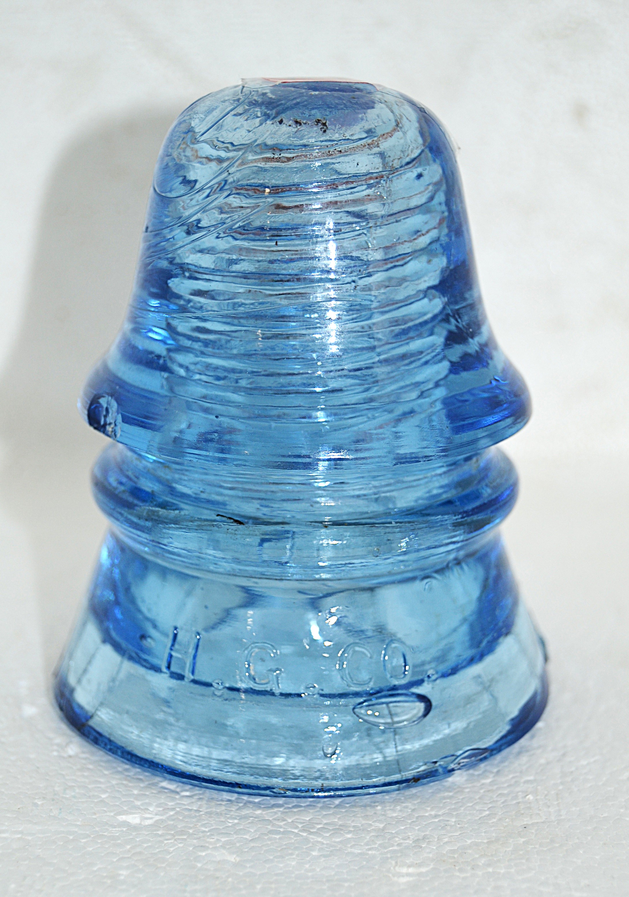 Listed is a CD 151 embossed H.G.CO. and on reverse side Petticoat - smooth base - color nice cornflower - damage consist of a chip on left side of upper wire rim, some roughness or back side upper wire groove, on base what appears to be a bubble with steam in it and a small ISC. Insulator is a lot better than sounds - Asking $375 plus shipping. Back view and base photos included. |
