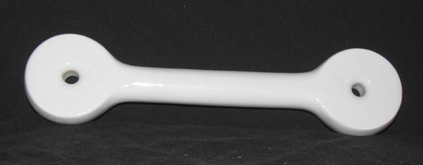 Here's a rare snow white porcelain French radio strain in a very unusual profile! Never seen this style made by other manufacturers. Has a raised round button (possible blot out) in the glaze on each side of the eye hole. Unembossed. Color glaze reminds me of PFC insulators. Measures 10.5 inches (end to end). Dead MINT condition. 1 of 3 known. Last one! First email gets this rare insulator for only $85 plus shipping. Thanks! |