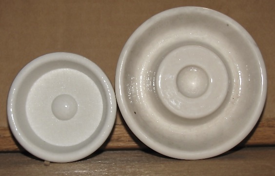Here's a complete 2 piece set of porcelain battery rests found in Luxemburg! These scarce examples have lots of unique detail in their molding: lots of X's criss-crossing the entire inner cup of the top and the entire base- a similar- but not identical feature found on some early (threadless era/transition era) rare porcelain insulators attributed to Norden! (See enlargement of pic for greater details!) Factory MINT condition! And oddly, the base has a small nipple on it too (typically only seen on the top rest), which may indicate these were used in a non-typical manner. Top piece measures 3 1/2" wide x 1" tall, bottom piece is 2 1/2" wide x 1" tall. Only a handful of these were found over 10 years ago. Last one! First email gets them for $125 shipped! Thanks! |