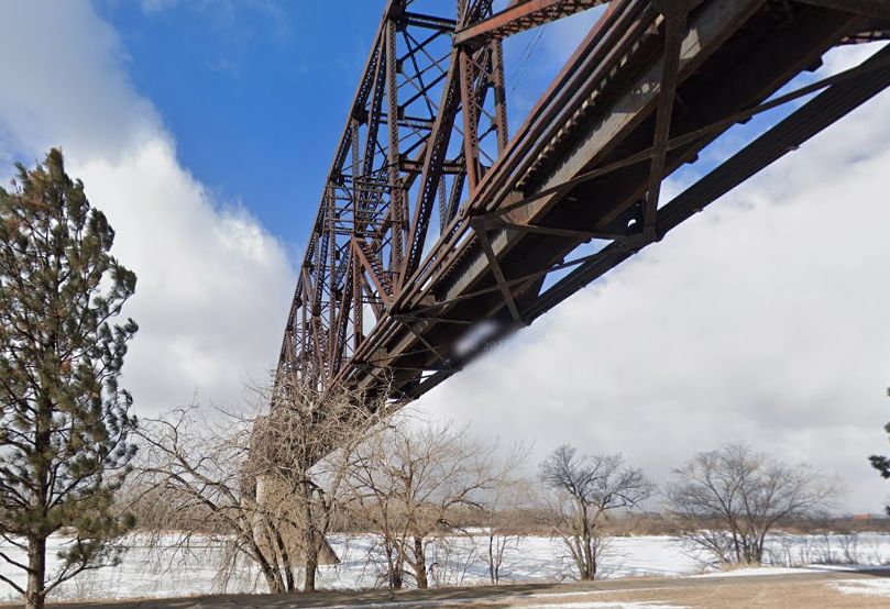 Here's a view from River Road in Bismarck, North Dakota of the Northern Pacific Railway Bridge. It's a day in March 2022, and the river looks icy and chilly.