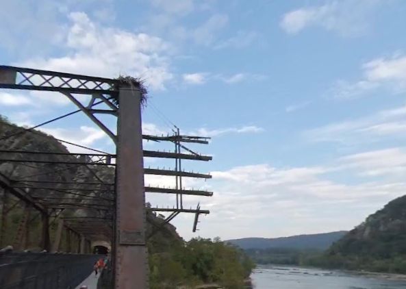 Here is a bedraggled crossarm structure on the Baltimore & Ohio Shenandoah Branch bridge at Harpers Ferry, West Virginia.
