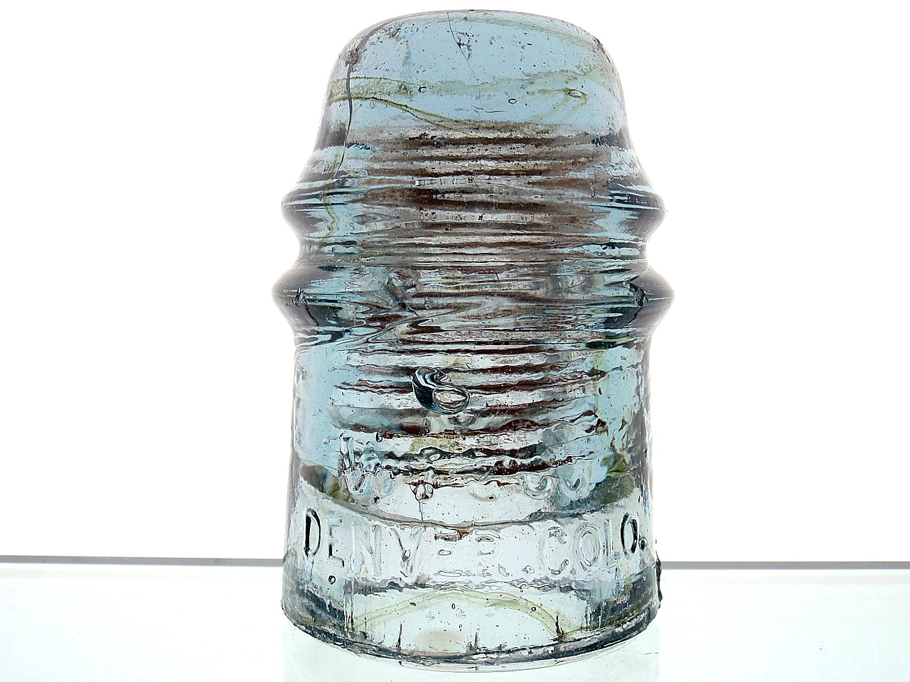 Sweet olive green swirls throughout this CD 121 toll. Five pencil lead point ticks, two 1/8" pecks, two smaller than a matchead wire ridge flakes, side base 1/23" flake next to a rear base 1.25" flake and some typical dome annealing lines is the damage report. $ 65.00 includes shipping. |