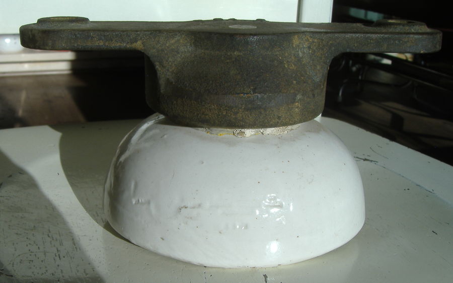This porcelain insulator is a U-931 white Imperial Porcelain with a metal cap fitted to the top. The embossing is very hard to read and I cannot tell what it is embossed for sure. The insulator is in very nice condition with no chips or cracks. This is an interesting porcelain and metal insulator setup. Priced at; $50.00 plus USPS Ground shipping cost. Thanks. |