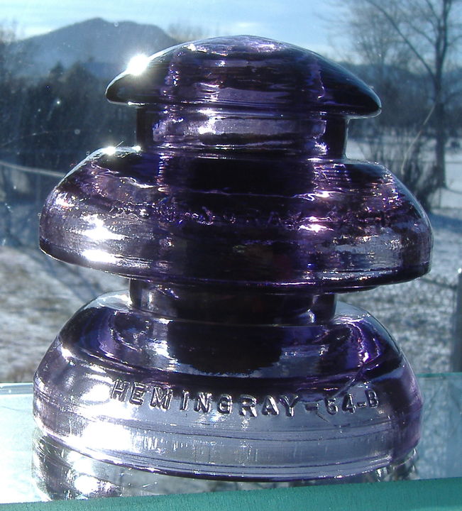 This insulator is a CD 195 top and a CD 194 base embossed Hemingray-54A on the top and Hemingray-54B on the base with Made In U.S.A. on the back. It is a beautiful purple color that these come in. The insulator is in very near mint condition with only some flaking on on the threads of the base. It comes with a pin to hold it together. A really beautiful displaying piece. Priced at; $425.00. Thanks. |