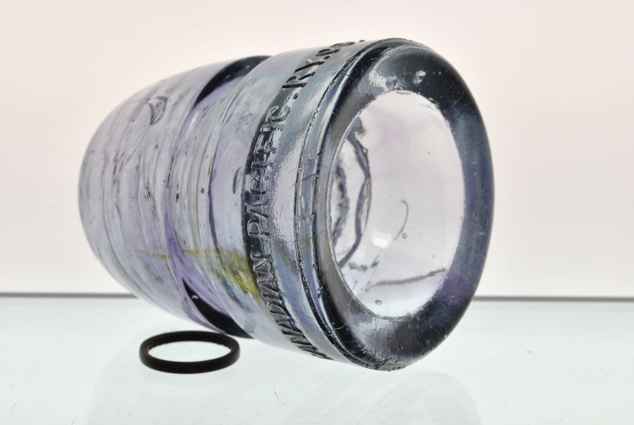 What a beautiful insulator and in amazing condition. There are several cold flow marks and stretch bubbles on the dome and crown that can be seen in most of the photos. The light amber wave or streak is visible in each of the photos as well. It looks to be EIN170. Damage is very minimial and consists of some light roungness around the inside of the skirt, a ½ inch by 1/8 inch deep chip of the inside of the pin hole. There is a two inch surface annealing line that starts at the dome and extends over the embossing side of the insulator. There is an 1/8 inch dent on the very top of the dome.