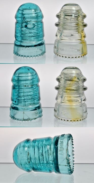 Left: Nice bubble! It is just a little smaller than a dime, but good size for such a small insulator. The color is a beautiful blue; somewhere between blue aqua and light Hemi-blue. It has the 1893 Patent date. Damage consists of a clean base chip that removes most of four drips at one spot. There are a few light surface annealing lines throughout the insulator, the most pronounced is just to the right of the bubble. There are a couple of flea bites and a small base chip that removes half of one drip point. $35 plus shipping Right: This "more modern" Hemingray 12 has a nice amber stripe that runs from the top wire groove down into the drip points, all on one side. The date code has a 41 and 6 dots, so made in 1947. There is a very very light scratch over the top of the dome. $45 plus shipping Take the pair for $68 plus shipping. |