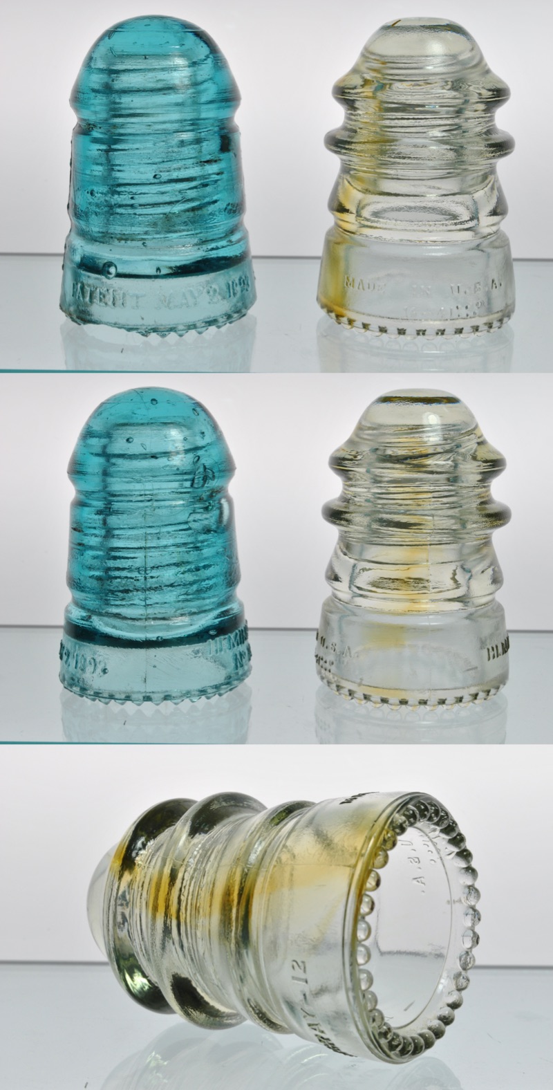 Left: Nice bubble! It is just a little smaller than a dime, but good size for such a small insulator. The color is a beautiful blue; somewhere between blue aqua and light Hemi-blue. It has the 1893 Patent date. Damage consists of a clean base chip that removes most of four drips at one spot. There are a few light surface annealing lines throughout the insulator, the most pronounced is just to the right of the bubble. There are a couple of flea bites and a small base chip that removes half of one drip point. $35 plus shipping