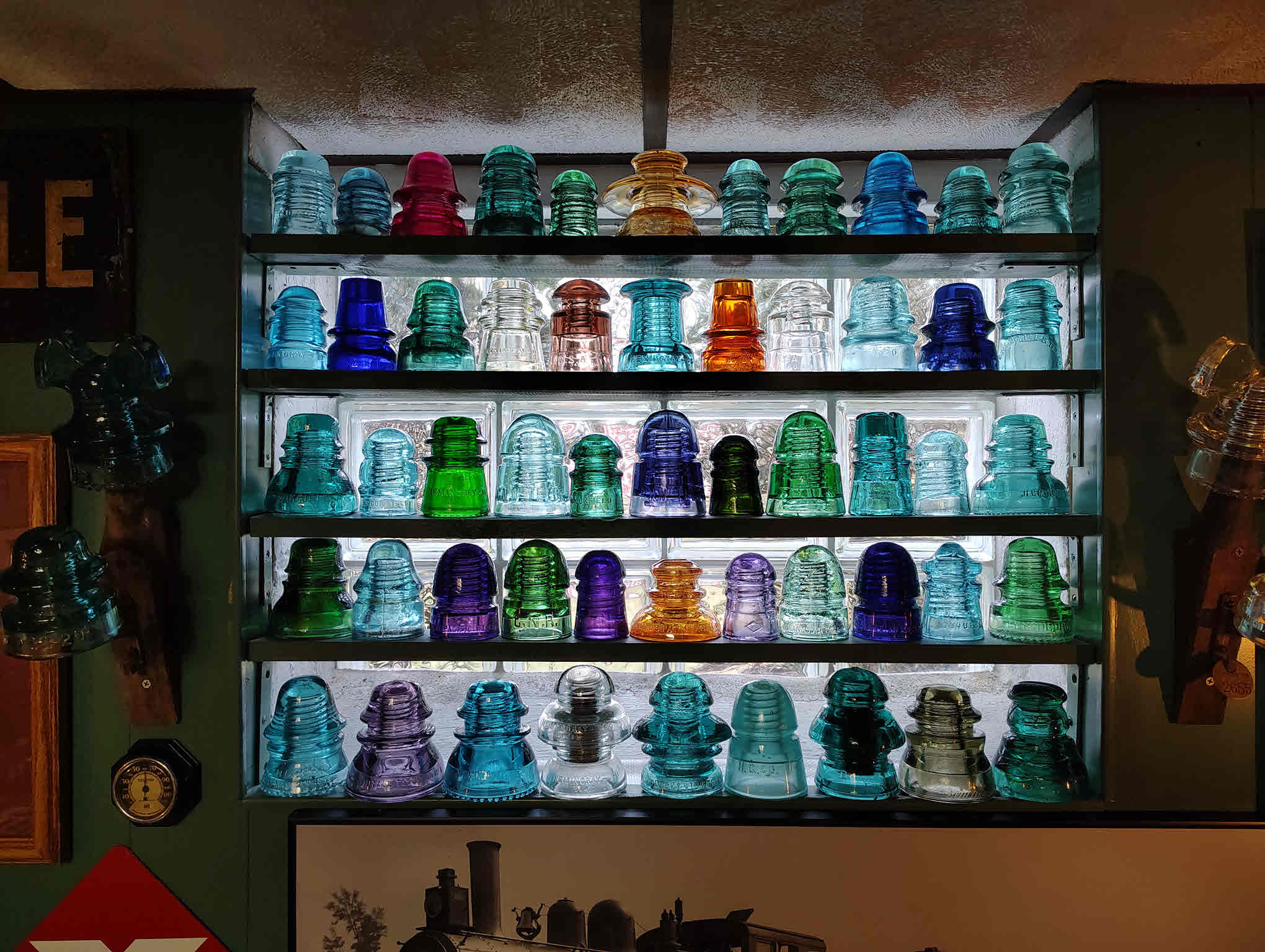 The retired engineer I mentioned in [id=772673305] has a nice window display of insulators in his basement RR memorabilia room. A few of the pieces are colored or irradiated (he wasn't aware of the irradiated purple ones, but he knew a couple of them were colored). But he has a couple of really nice pieces, including a glass PRR transposition, and a CD 116.5. |