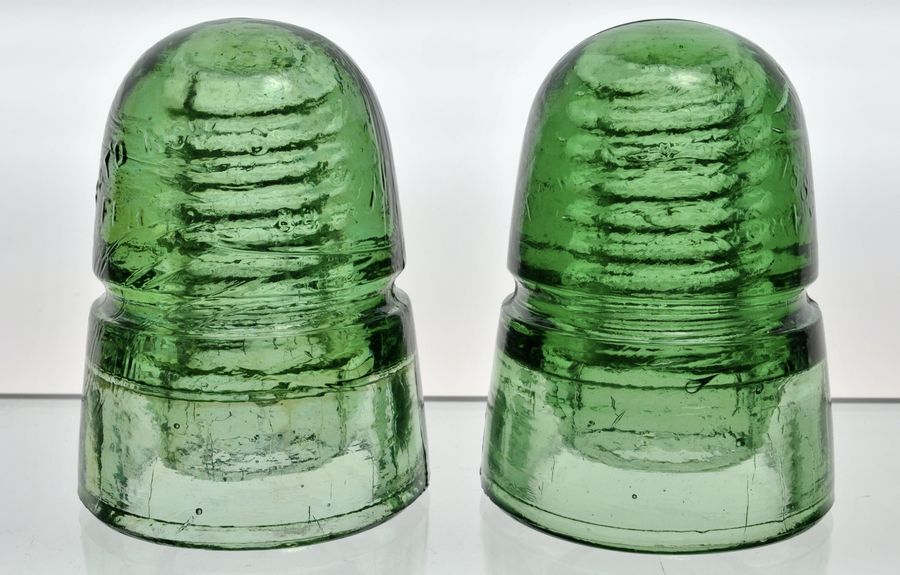 Right: Brookfield Yellow Green. Front: Shop Number 10 (dome). Appears to be a "10b [BC]" in Lee Brewer's book. (ARC) W. BROOKFIELD / 45 CLIFF S T / N.Y. There's extra space between CLIFF and the "S" and extra space between the "S" and the "T". Also, it is a capital "T" and not small, nor underlined, "T". BACK, the embossing begins "PATD" (no apostrophe). The letters and numerals are quite large. The embossing is most similar to the (215) EIN. A major difference with this insulator is the shape of the dome. It's more vertical, narrower and less round than the dome on a normal 1883-1884 CREB . There is a teeny skirt flake near base and a small spot of wire wear and bruise in the wire groove behind the right mold line. There are also natural annealing lines in the skirt. $230 plus shipping.