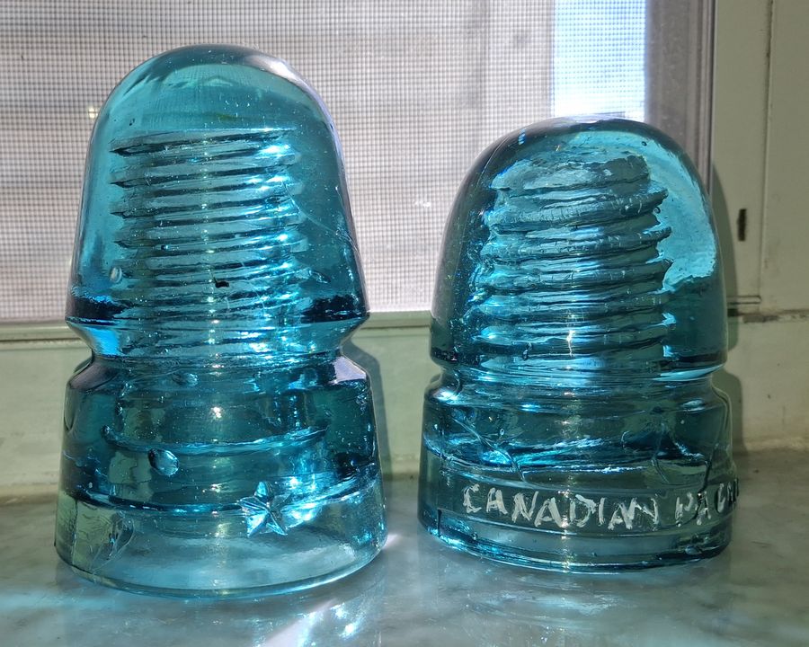 One CD 145 STAR tall Beehive the only flaws I see are a B-B bruise on the front dome and wire groove scuffing. $20 plus shipping. One CD 143 CANADIAN PACIFIC RY slug-plate embossed. The flaws I see are a B-B bruise on the side of the dome and quite a bit of scuffing in the wire groove. None of the usual base chipping. One of the few I have had with no base damage. Pretty color. $40 plus shipping. |