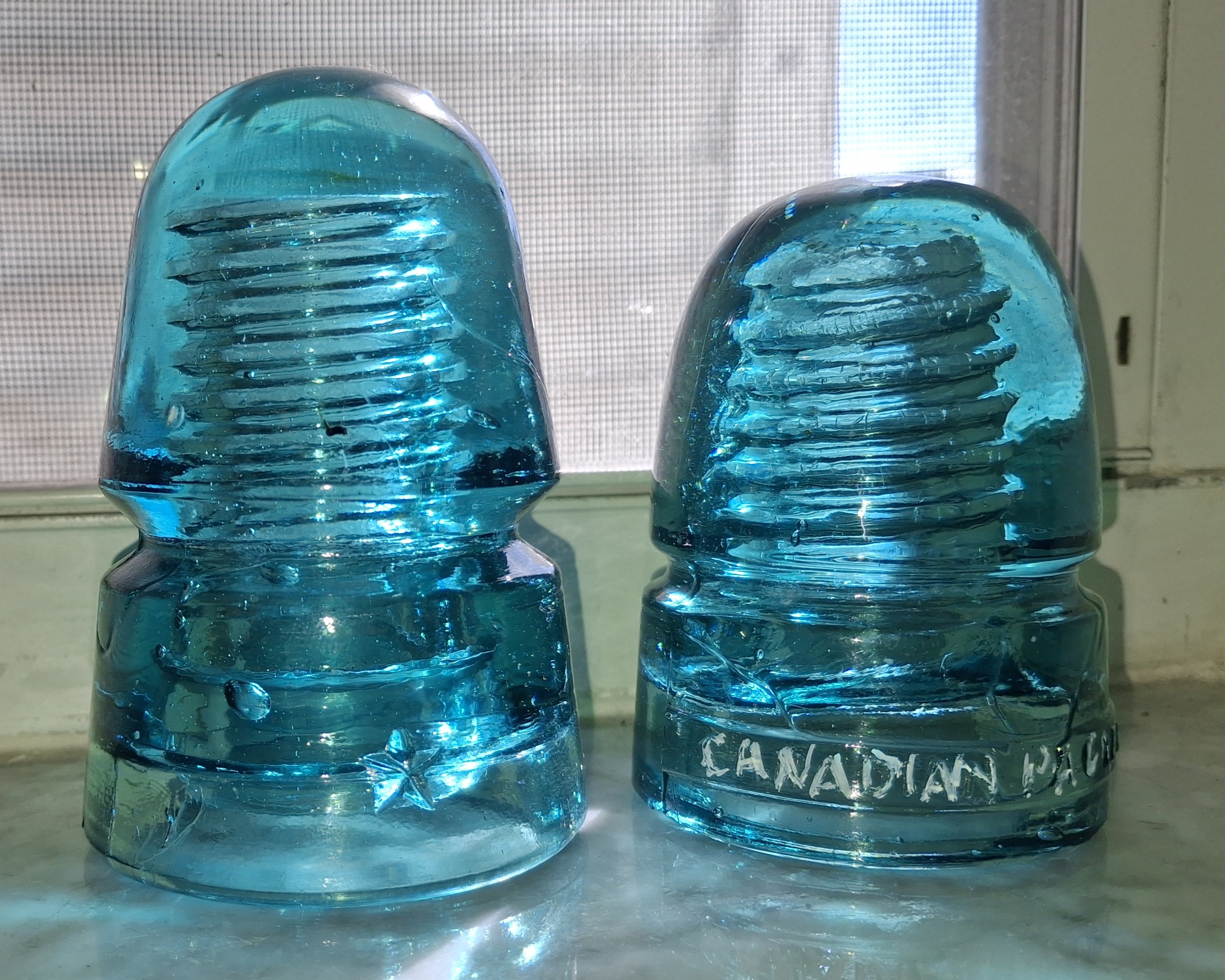 One CD 145 STAR tall Beehive the only flaws I see are a B-B bruise on the front dome and wire groove scuffing. $20 plus shipping. SALE $15 One CD 143 CANADIAN PACIFIC RY slug-plate embossed. The flaws I see are a B-B bruise on the side of the dome and quite a bit of scuffing in the wire groove. None of the usual base chipping. One of the few I have had with no base damage. Pretty color. $40 plus shipping. SALE $30 |