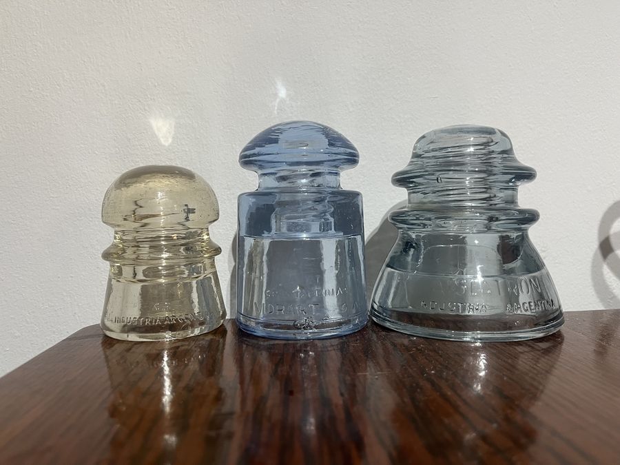 Hi everyone! On this occasion, I'm offering a lot of three different insulators, in three different colors, sold together as a set. In the photo, you'll see three different CD styles, shown in this order: CD 101.6, CD 128, and CD 154. Insulator descriptions: CD 101.6 Color: Straw Embossing: CR – INDUSTRIA ARGENTINA This embossing corresponds to Cristalerías Rigolleau and is less common, as this CD is more frequently found without the "CR". Details: Small chip behind the embossing Two round BB hits with very minor damage Despite these flaws, it displays perfectly, as shown in the photos. CD 128 Color: Sky blue Embossing: Cristalería Vidrart S.A. 6 / TE A123 – INDUSTRIA ARGENTINA Details: Two bubbles on the top One bubble behind the embossing No visible chips or cracks Light glass sickness on one side Overall, it displays beautifully. CD 154 Color: Light cornflower blue / steel blue (not completely sure which designation is correct) Embossing: Cristalería Vidrart S.A. 35 ENTel A17 / AISLATRON – INDUSTRIA ARGENTINA Details: Small chips on the inner skirt Mold error inside Minor flea bites on the top and in the wire groove If you would like additional photos or videos to better see the details, feel free to contact me by email or on Facebook: Pablo Daniel Sueldo. Price: $150 shipped. LAST OFFER Shipping cost is approximately $50 Shipping does not apply to PO Boxes. (In those cases, shipment must be sent to a DHL office, as I'm not allowed to ship to PO Boxes.) Remote areas may have a small additional charge, due to higher shipping cost. Payment: PayPal — Goods & Services only. For reference, book prices for these insulators are significantly higher: CD 128: $175 CD 101.6: $50 CD 154: $30 First email or message takes this awesome set of insulators. |
