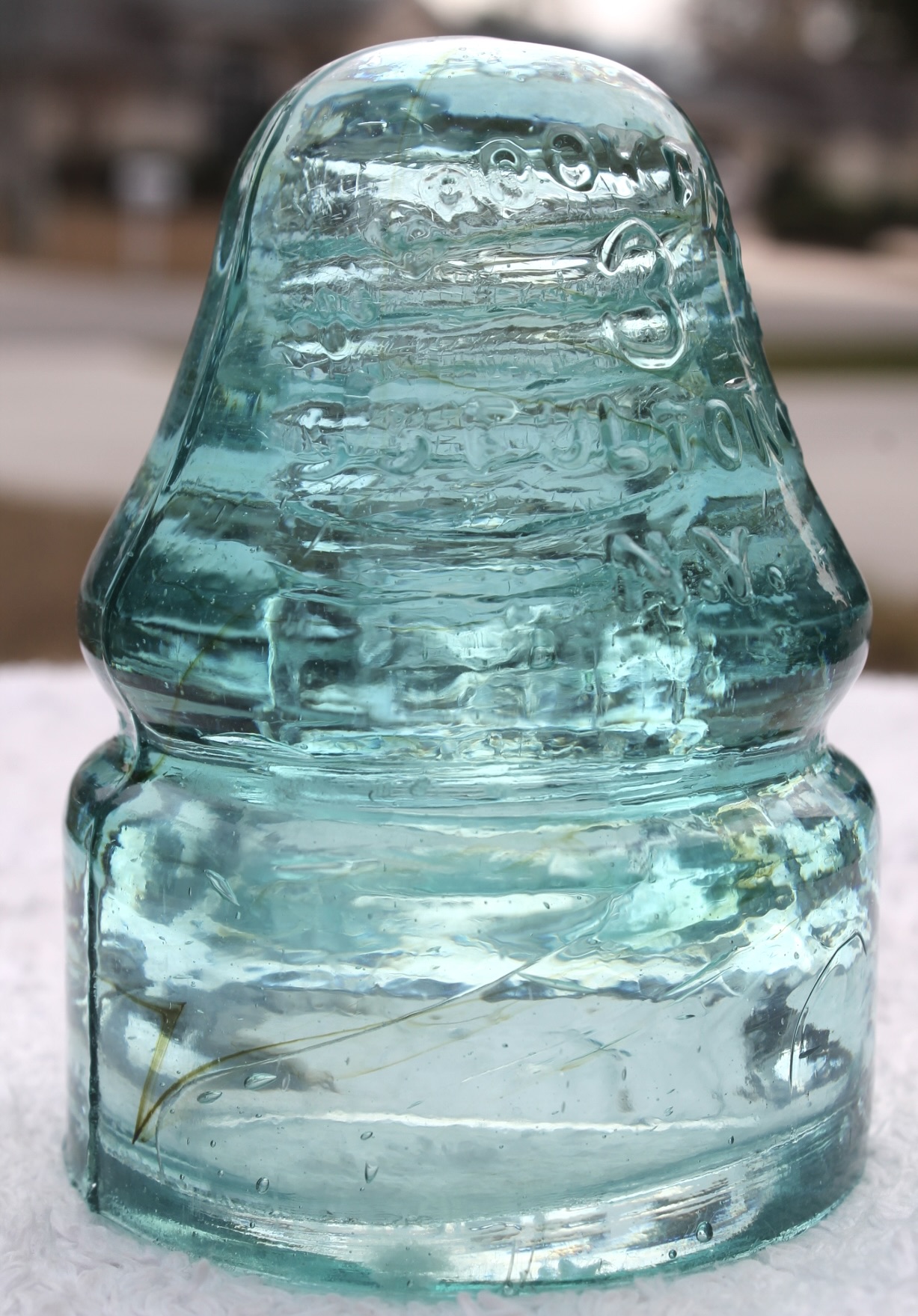 Here is a shining CD 133(230) with completely legible crown embossing in arc is W.BROOKFIELD with a large 3 in center, below is 55 FULTON ST./N.Y. on the reverse crown in arc is CAUVET'S/PAT./JULY 25, 1865. Has a very light unique milky swirl in the crown(only seen it when looking with flashlight) along with amber strings similar to a spiders web down toward the skirt. With a strong MLOD mold line there is a small open base bubble and two short wire groove rub spots. The pinhole has a no glass missing bruise at the transition from vortex to thread. $45 plus $10 shipping. PayPal, Venmo or check. Thank you. |