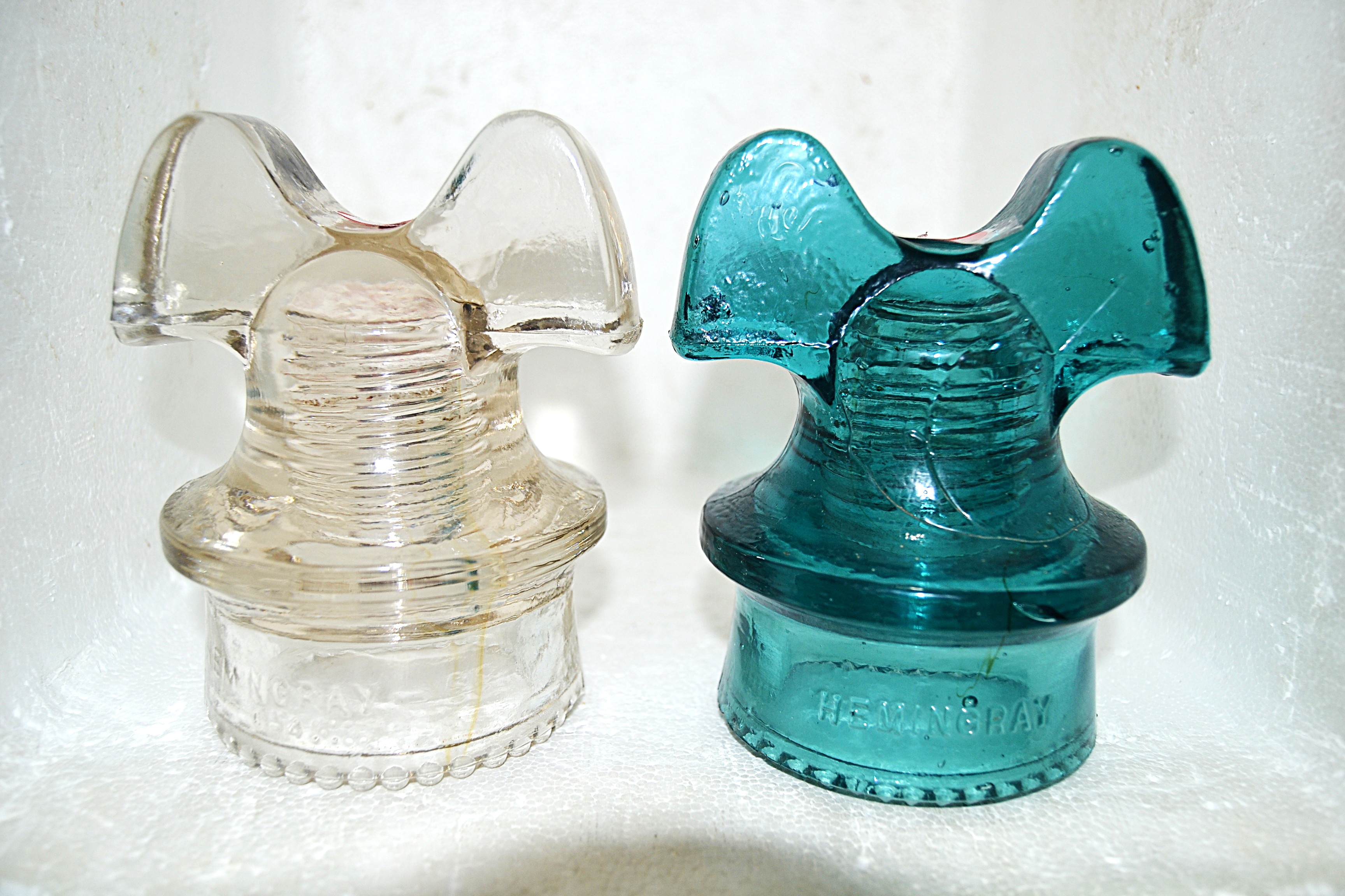 Clear to slightly straw embossed Hemingray - 60 and rear skirt Made in U.S.A. - Round drips - See no flaws - $38 --- Hemingray Blue embossed Hemingray and rear skirt No. 60 - Sharp drips - Several drips not filled in - $88 plus shipping.