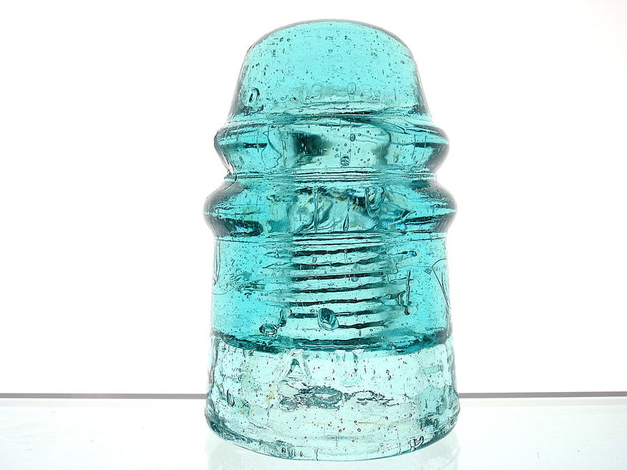 Difficult to find in the blue color spectrum. Lots of bubbles add sparkle. CD 121.4 PATENT DEC 19 1871 / A.U. oldie telegraph. Rear lower wire ridge half matchead flake, rear crown light bb size bruise and a side upper wire ridge 1.0" chip as seen in pic # 2. $ 55.00 includes shipping. |
