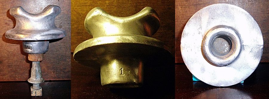 Came across this unique piece. It's an insulator MADE OF METAL!!!! Well sort of. This is a neutral wire bracket insulator. I have seen similar designs in catalogs but this one actually screws onto a 1" American threaded pin. It is stamped with a 1 and has a label 1708. I'm thinking it could be A.B. Chance Co. although I have catalog pages from Joslyn Mfg. Co. and Line Material Co. showing them with a bracket. I found one patent US 2,018,532 Oct 22, 1935 but it is for the spool neutral bracket. These were used to support a nuetral wire dropping down from a pole. I'm assuming they were short lived because you could use a secondary rack spool or even a pin typoe insulator to do the same thing. It is basically a crown of an insulator that threades on a pin. Although most I've seen in catalogs have a molded bracket on them to screw into the side of a pole. This is only the second piece I've ever seen. One bracket style I saw for sale a few years back but wasn't able to aquire it. If anybody has any of these or pictures of them in use I'd love to see them. Can you say Heavy Metal what do I want. |