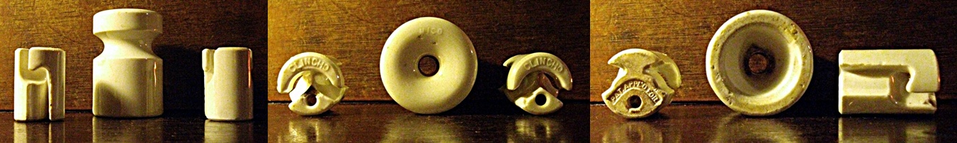 As I said I was having some luck finding rare nail knobs etc. when I came across this large knob. It measures 2" X3" and is marked MICO (Moglodore Insulator Co.). This company is hard to find but I have several pieces made by them. Pictured with this knob is the no tie style made by them. On the left side is marked CLINCHD misspelled and Pat Appl'd For on the bottom. On the right is marked normal CLINCHO and on the bottom Pat Appl'd For. Either way they are rare to find. |