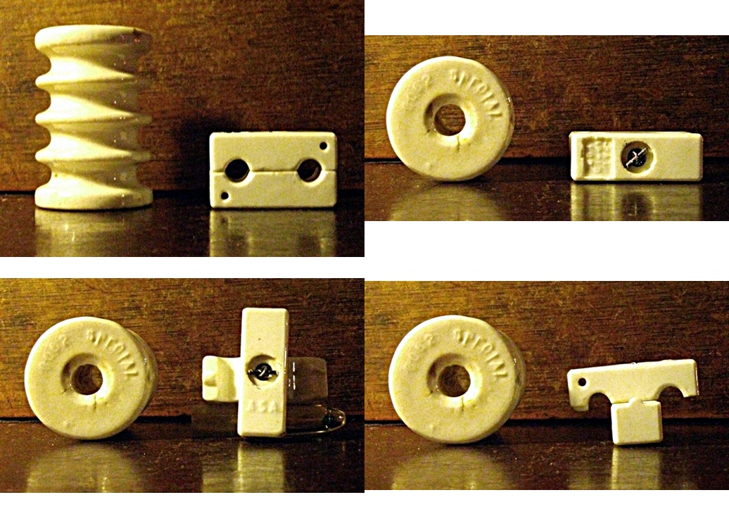 I've had these two pieces for awhile but have no idea as to who made them. The first is a large telephone drop spool. It is marked 6062 SPECIAL. It measures 1 1/2"X 2 1/2". Larger than most Tel spools and with wide grooves. I guess not knowing who made it makes it special. Brain freeze! The second piece is a "special" two wire cleat. It has a spring holding it together and is hard to twist apart. It has raised and mating recessed grooves . On the one side it is marked A.S.A. and on the oither Pat. Appl'd For. It measures 1 1/2"LX1"HX1/2"W. Very very unsual. I'm assuming it is a wire seperator since it has no screw holes. Just 4 small holes on each piece for what I don't know. |