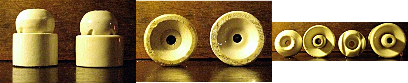 It sounds like an exotic tropical bird but refers to a no tie screw knob. It was sold by the Paragon Electric Co. and is called the Paragon Knob Insulator. It falls under patent US965,723 July 26, 1910. I have several of these and none are marked. Elton Gish has one on his webpage that is marked Patent Pending. That is a confusing statement because it states that a patent for the design is in the process of being issued. Many companies used this though to promote there product even if they were not applying for a patent. The object being someone would chose there item over something as not being patented. Anyways a patent was issued to this company but who made the pieces is not known, sort of. In Jack Tod's book Electrical Porcelain of The United States he has a picture of a catalog page from Porcelain Products Inc. showing the Paragon Knob. I wish I knew the date of that page but it is not shown. When viewing my collection, I noticed a difference in one of the knobs compaired to the others and I think it was made by Porcelain Products Inc. The piece on the left has an unglazed bottom, sharp edges on the bottom top, a bigger recess in the top where a screw would go. The piece on the right is slightly smaller, has a glazed bottom, rounded edges on the bottom top, and slightly smaller recessed hole in top. It is also more refined like modern porcelain pieces. This is why I think it was made by P.P.Inc. Who knows who made the other style. Could be a number of porcelain companies but somewhere down the line P.P.Inc. gained the rights to make this item. My guess is maybe Findlay Electric Porcelain Co. or General Porcelain Co. when they aquired Brunt Porcelain Mfg. Co. made the pieces before. Then P.P.Inc. merged with these companies in 1928. I have a 1928 P.P.Inc. catalog but it does not show this nail knob. . Who knows . Time will tell someday. Awsomly neat pieces anyways. |