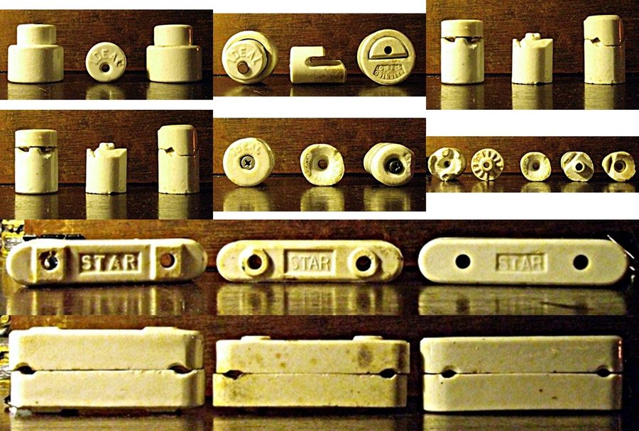 While on the subject ofrare nail knobs, I thought I would show some pictures of the pieces I have made by The Star Porcelain Co. Mainly known for there contract buissness making speciality products for different companies, their own products are hard to find. I have a handfull of items from them. As I mentined in another post, there was a Star embossed bridle ring insulator. I have some star made radio strains somewhere and the Red Devil standoff insulator I'd have to find and post sometime. They were known for the Nu-Black porcelain insulators made foir Cook Pottery Co. Philco Radio Co. Fleron Radio Co.and other companies they had contracts for. In this picture is items made by them as far as electric house wiring. The top two picture rows are of the self tying IDEAL knob patent US855,208 May 28 1907 and the oval shaped nail knob marked Star on the top and Pat Dec 5 05 on the bottom. It falls under patent number US 806,588 Dec 5 1905. .Also is the IDEAL nail knob. It has a neat radial grip pattern on the underside of the top and the bottom is similar to early Cook Porcelain Co. Wedge nail knobs. The bottom picture shows three different embossed wiring cleats marked Star. |