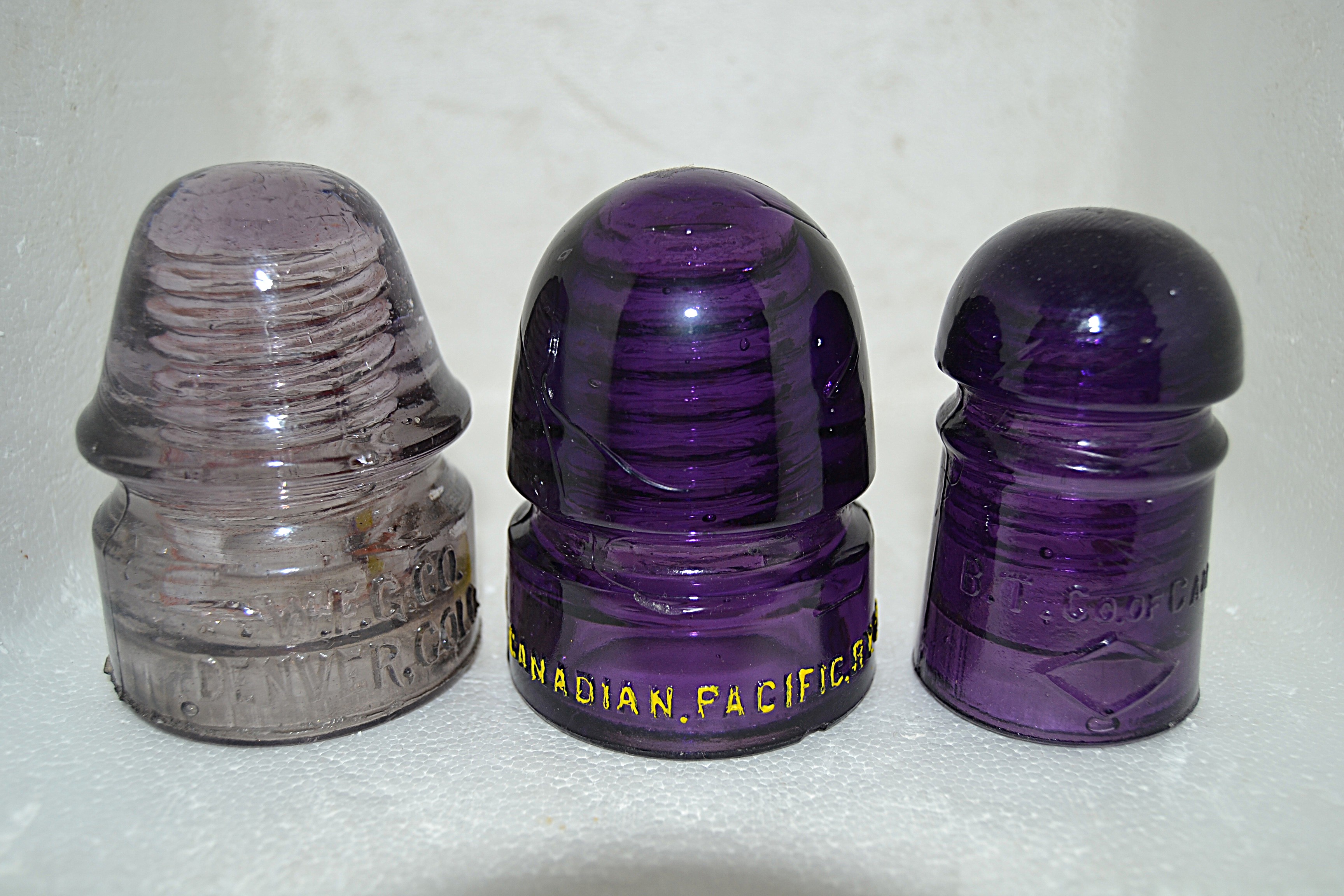 Right - CD 102 embossed B.T.Co of Can. Diamond on front and rear - See no flaws but will classify it V.N.M. $50 -- Middle - CD 143 embossed Canadian Pacific Ry Co. Small open air bubble on front base $100 - Left W.F.G, CO. Denver, Colo. - good condition V.N.M. $95 --Postage added ground rate. |