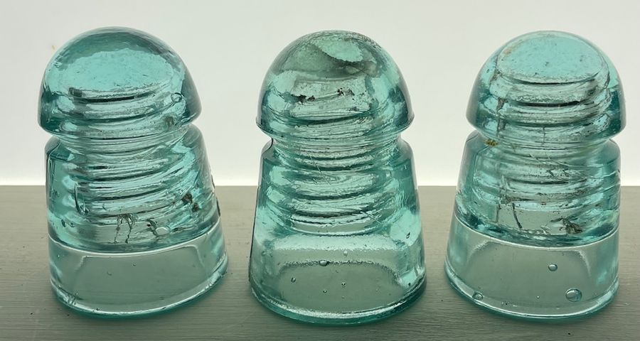 All three are in nice overall condition. There may be a few wire scuffs, a ping or two, a bird peck above the wire groove on one and the center insulator has two pinky nail size flakes on the underside of the upper wire groove and a shallow 1/2 pinky nail size flake off the base. Mentioned more for accuracy than distraction. The right and left are embossed BROOKFIELD NEW YORK. The center insulator has a nice graphite swirl in the dome and is embossed in small font W BROOKFIELD 45 CLIFF ST NY. This also has a flat base while the other two are more rounded. Asking $25 plus shipping. |