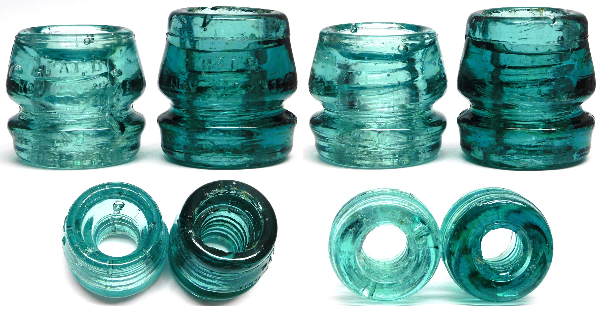 Here are two CD 187's, both EIN [010] (F-Above wire groove) PAT'D/NOV. 23D 1886 SB. On the left is a short version in Light Aqua. Damage is limited to some surface wear on the embossing, a ½" stress fracture at the base, typical nibbling around base pinhole, and a couple of tiny pecks on top. Numerous bubbles throughout add character. On the right is the tall version in Dark Aqua. It has a ¼" chip to the lower wire ridge at the right mold line, typical nibbling around the base pinhole, nibbling and chigger bites around the inside edge of the top, and surface wear from years of rolling around. Sounds worse than it looks, as seen in the photos. Asking $50 for the pair shipped in the US. CK/MO. |