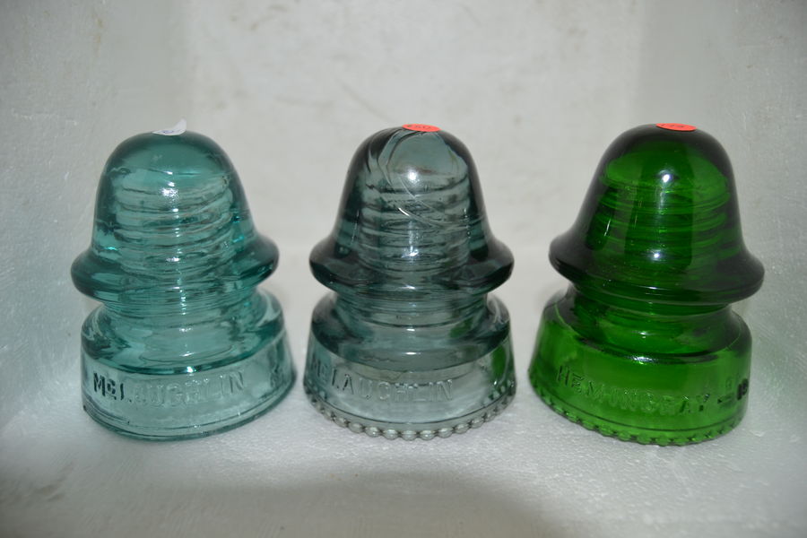 Left - Embossed McLaughlin back No 19 Smooth base - Bluish - See no flaws - $28 --- Embossed McLaughlin back No 19 - Round Drips - Blue gray leaning to dark delft blue, Darker than picture. - see no flaws - $75 --- Right Hemingray - 19 rear made in U.S.A. Round drips - Seven Up green -See no flaws - $165 - These three are in awesome shape. Postage added. |