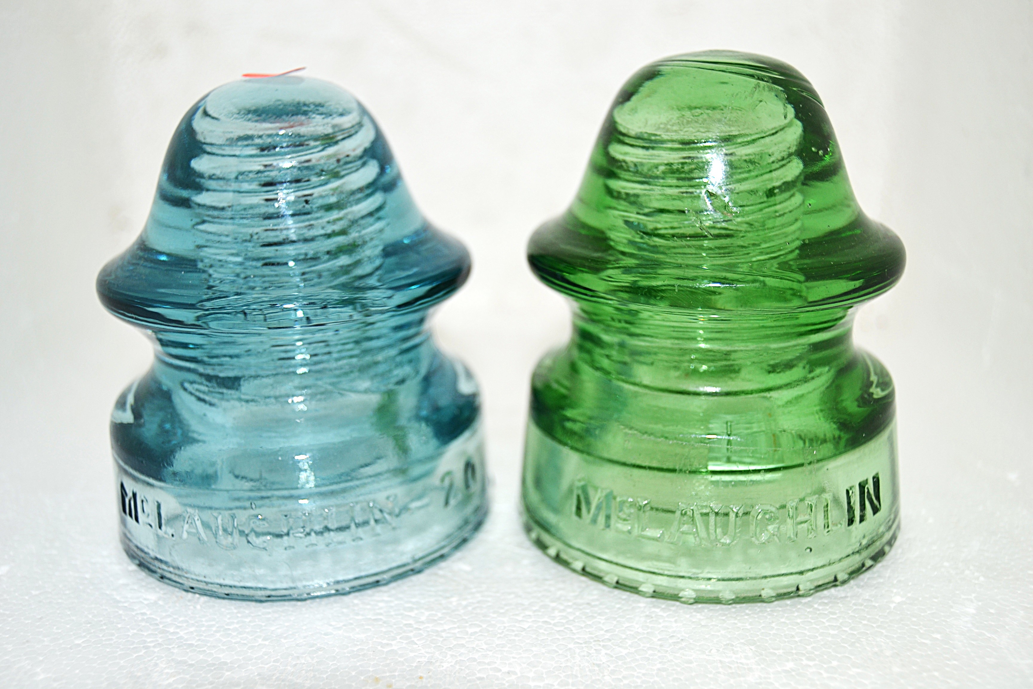 Left embossed McLaughlin - 20 - Flat drips - Light cornflower blue - See no flaws - $65 --- Right embossed McLaughlin and on rear skirt No.-20 - Small sharp drips - Lime green - see no flaws - Apple green - $45 - Postage added.