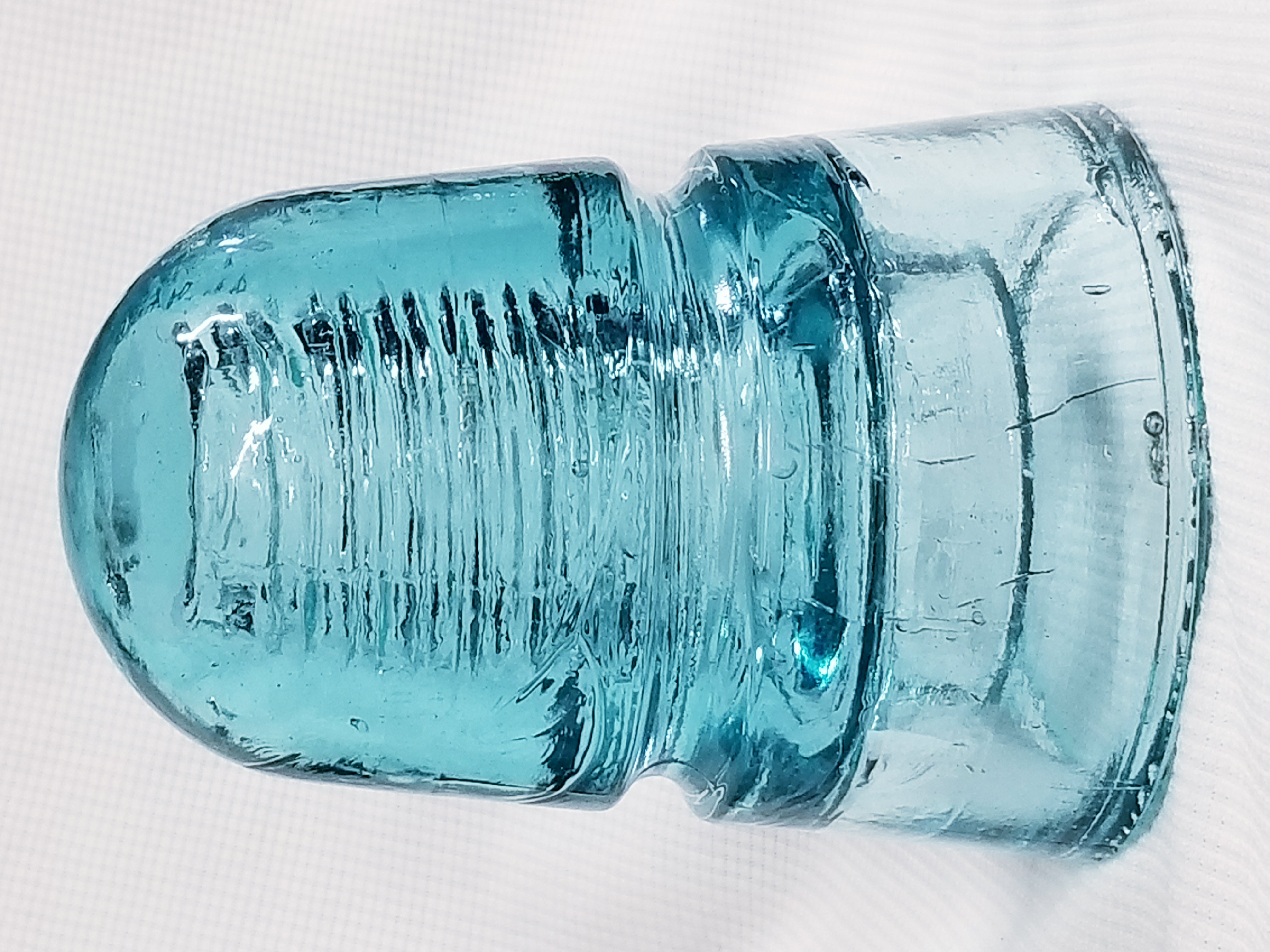 CD-145 Base Embossed THE STANDARD GLASS INSULATOR CO BOSTON MASS - PIC2 - light blue-aqua, shiny shimmering clean glass with a few bubbles and extra fine threads. Has a 1" long by 1/8th" shallow surface horizontal fracture at the bottom wire groove edge that is practically invisible as displayed. And one shallow 1/4" base rim outer edge flake that does not affect embossing. A tough New England beehive with classic BOSTON embossing in fabulous condition. $400 Shipped to lower 48. I prefer PayPal F&F and accept Zelle, Cashier's Check, Personal Checks (if we've done business before) Thank You!!! |