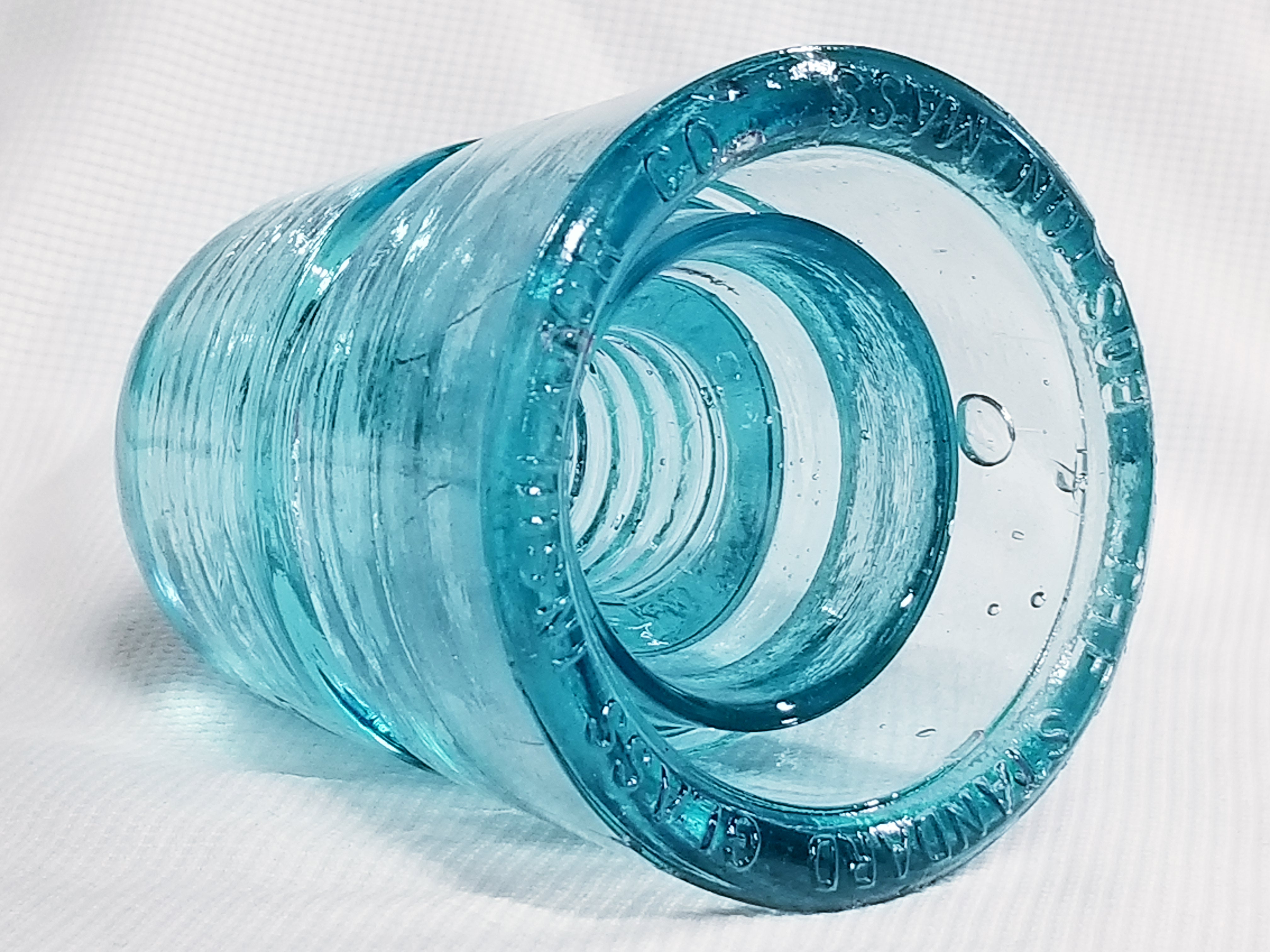 CD-145 Base Embossed THE STANDARD GLASS INSULATOR CO BOSTON MASS - PIC3 - light blue-aqua, shiny shimmering clean glass with a few bubbles and extra fine threads. Has a 1" long by 1/8th" shallow surface horizontal fracture at the bottom wire groove edge that is practically invisible as displayed. And one shallow 1/4" base rim outer edge flake that does not affect embossing. A tough New England beehive with classic BOSTON embossing in fabulous condition. $400 Shipped to lower 48. I prefer PayPal F&F and accept Zelle, Cashier's Check, Personal Checks (if we've done business before) Thank You!!! |