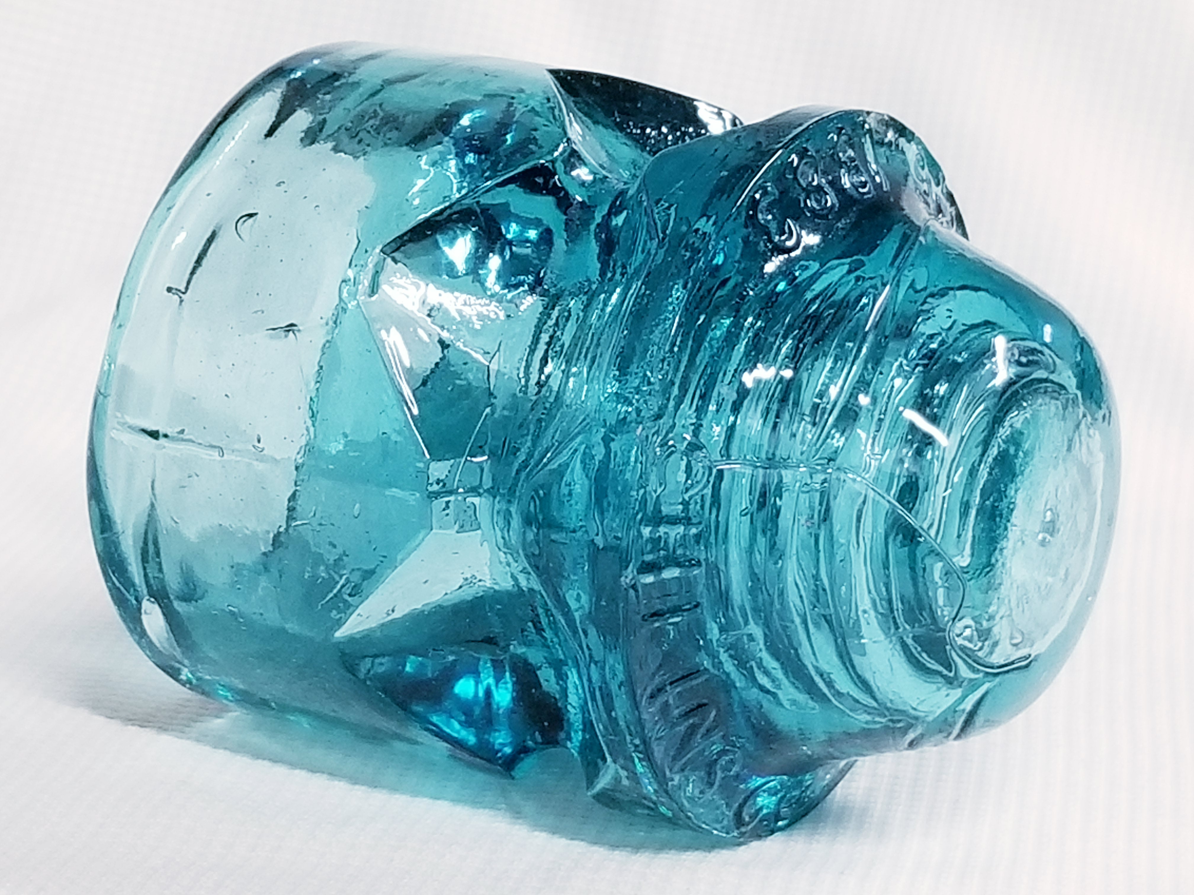 CD-135 Shoulder Embossed CHI INS CO PATd OCT 16. 1883 - PIC3 - medium blue-aqua, shiny shimmering clean glass with a few bubbles, creases and slight underpour. Has only a few tiny shoulder rim nicks and tiny manufacturing flakes that are intact. Very minor manufacturing flaws all located on the 1883 edge and none of which affects the BOLD embossing. A clean, shiny, crude diamond groove in fabulous condition. $100 Shipped to lower 48. I prefer PayPal F&F and accept Zelle, Cashier's Check, Personal Checks (if we've done business before) Thank You!!! |