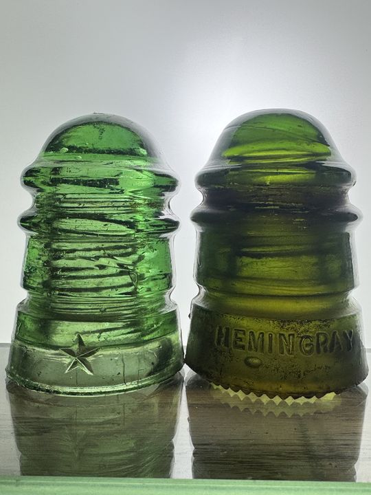 Dark yellow green Hemingray has one tooth flaked clean off but is otherwise mint. Yellow Green Star Keg has a 1/3" base flake on the base.