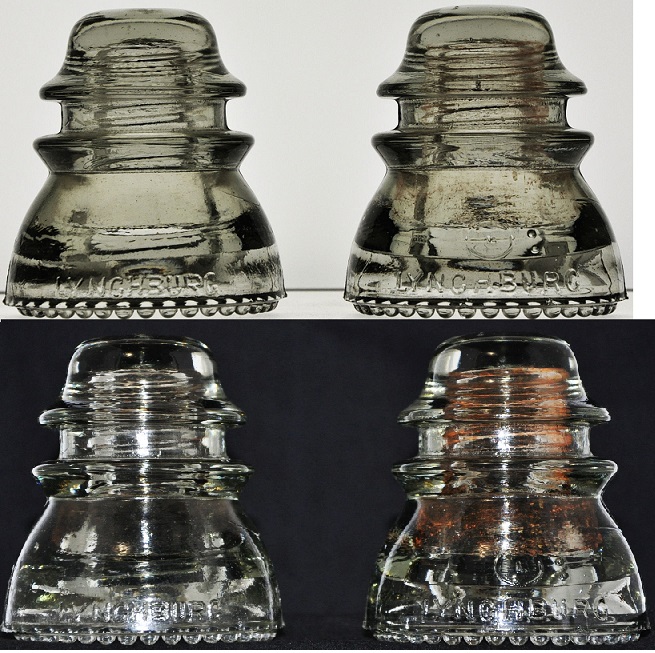 Left to right: CD 154 LYNCHBURG [040] -- CD 154 LYNCHBURG [070] I'm calling these insulators Off Clear, but both insulators are very close to clear. The top photo is backlit and the bottom photo is using a flash with a black background. Both are VNM with no damage to report. The one on the right has a bit of staining in the threads that I have not tried to remove. Asking $30 each or $50 for the pair, plus actual shipping. I accept money orders, checks, or PayPal – Friends & Family. |