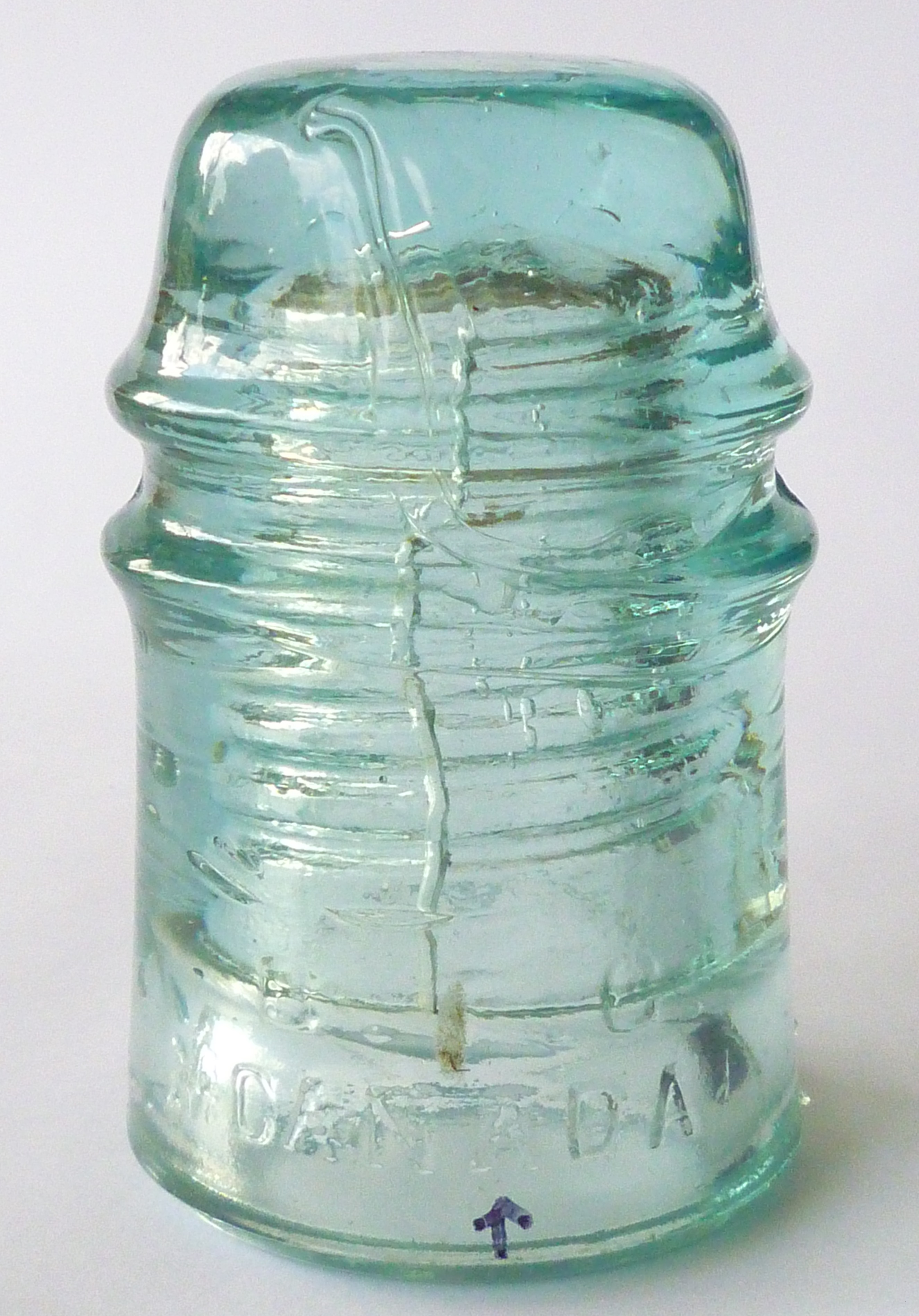 CD 121 B.T.C. / CANADA / MONTREAL blot out. Note: the 2nd " A " in CANADA has no crossbar . AQUA GLASS. Smooth base, Some thin annealing lines in the threads. " Straw mark " on front dome. Nice overall condition with no other distractions to note. Stock #a4071 $10.00 + shipping |