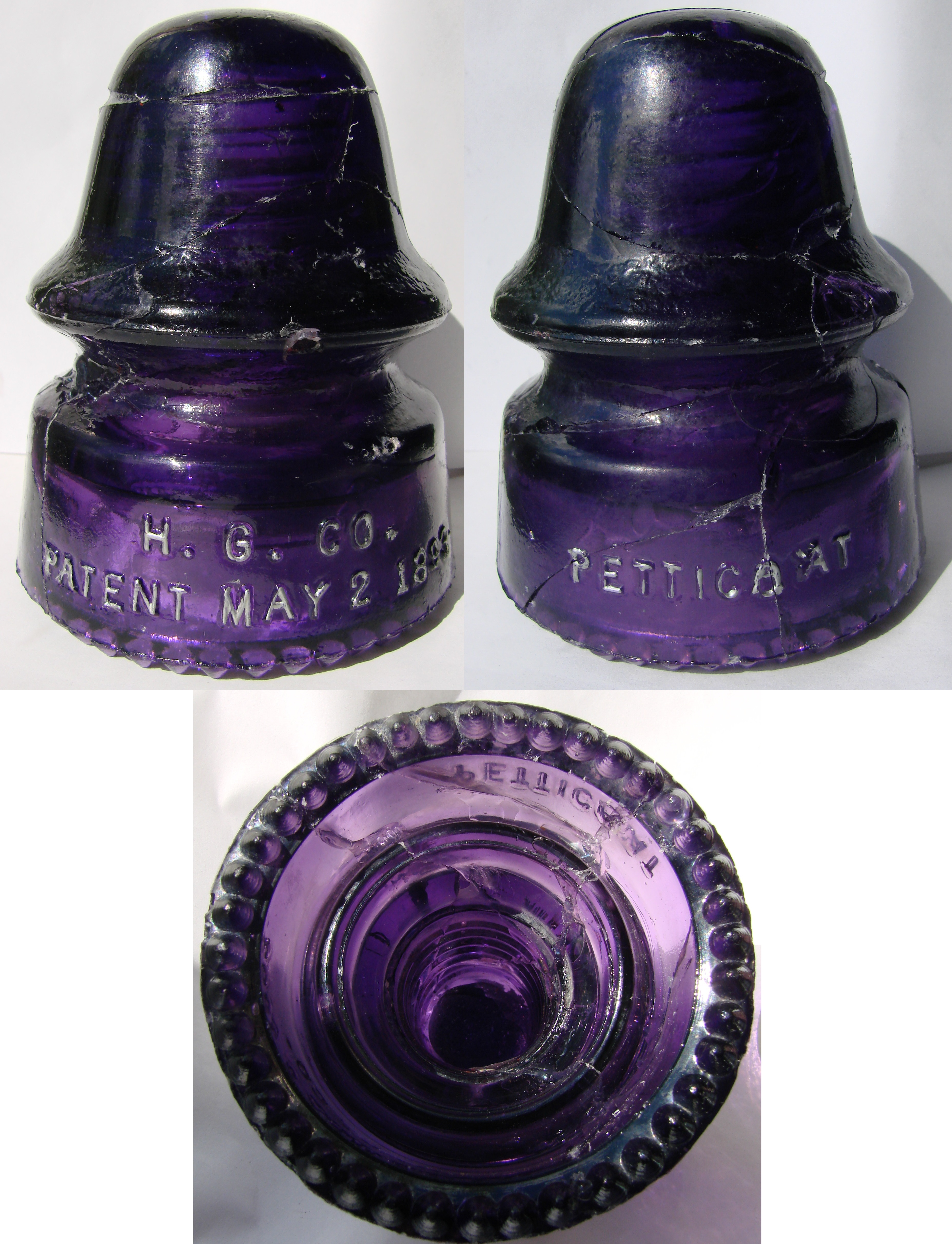 A CD 162 signal in Royal Purple {front skirt} H.G.CO. / PATENT MAY 2 1893 // {rear skirt} PETTICOAT (O over A, A over horizontal Y?) embossing error. Unfortunately it is a repaired "Kitsulator" of a dozen pieces. 98% all there. It even has all it's drip points. $225. + postage. |