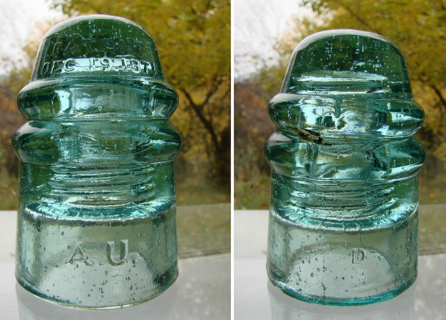 a CD 121.4 {dome} PATENT / DEC 19. 1871 {front skirt} A.U. {rear skirt} D . in Lt Green with seed bubbles. $70. + postage.