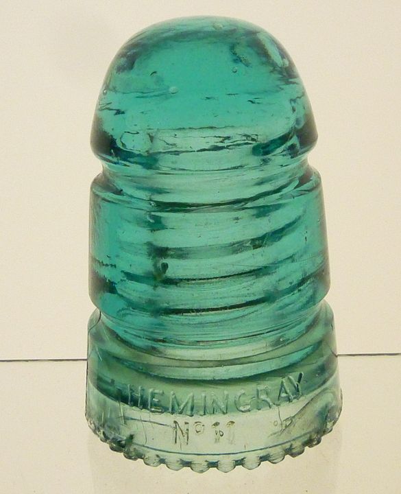 USED CONDITION CD 114 HEMINGRAY / NO 11 pony insulator. Rear skirt embossed: PATENT MAY 2 1893 BLUISH AQUA. Sharp drip points. All are intact. Two small bruises on inside edge of skirt, but no glass is missing. Overall nice condition. No distractions to note. Embossing bold and very distinct. Nice amount of dome glass. $10.00 + shipping. Stpck #3158 |