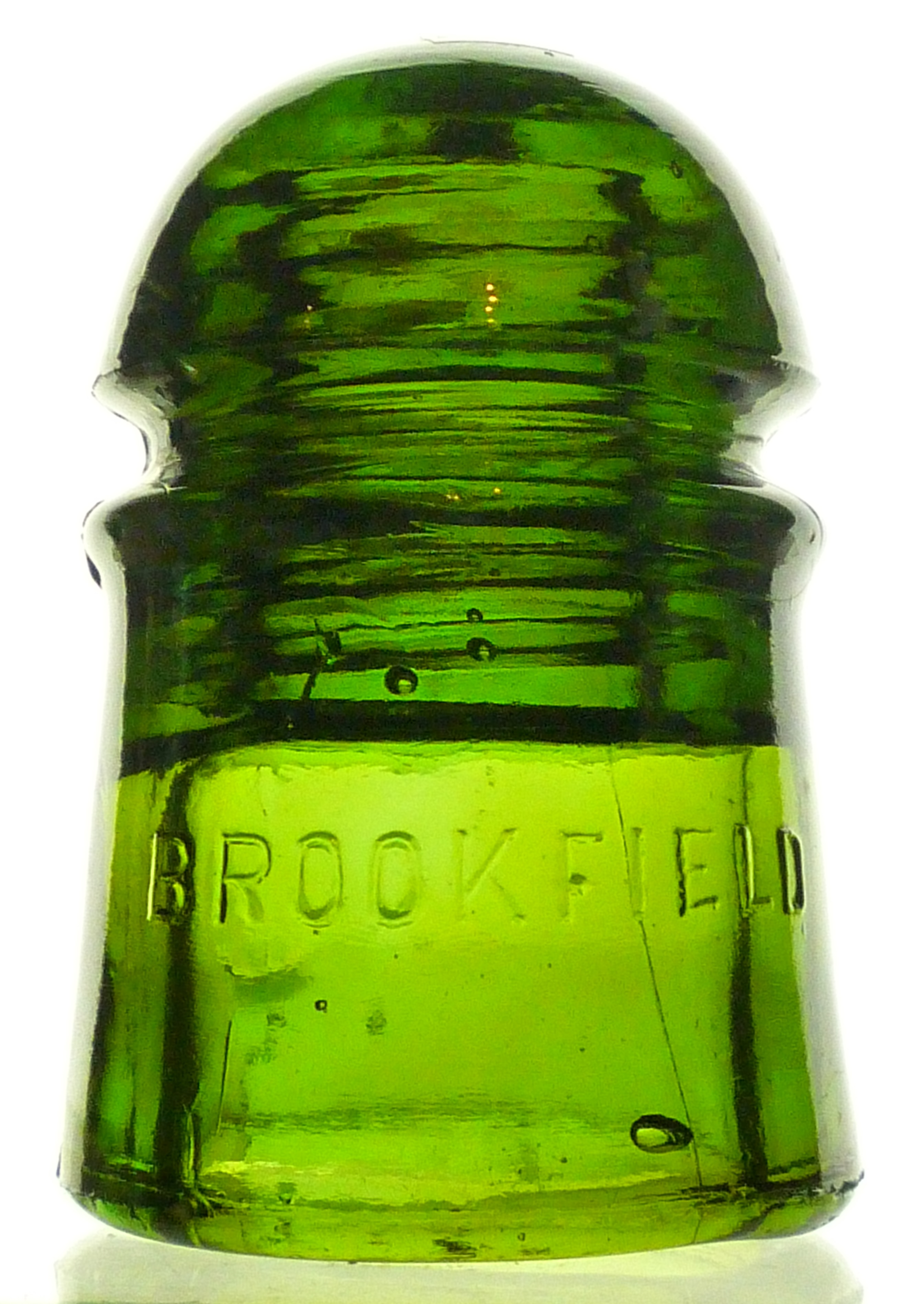 USED CONDITION CD 102 BROOKFIELD pony insulator. Smooth base. " XO " mark on dome. DARK YELLOW GREEN. Has a quarter size bruise on back. But, no glass is missing. Also, a small " fisheye " on rear dome (SEE NEXT PHOTO) Overall a nice condition piece with no other distractions to note. Displays great from the front side and the color really glows. Stock #a4112 $15.00 + shipping |