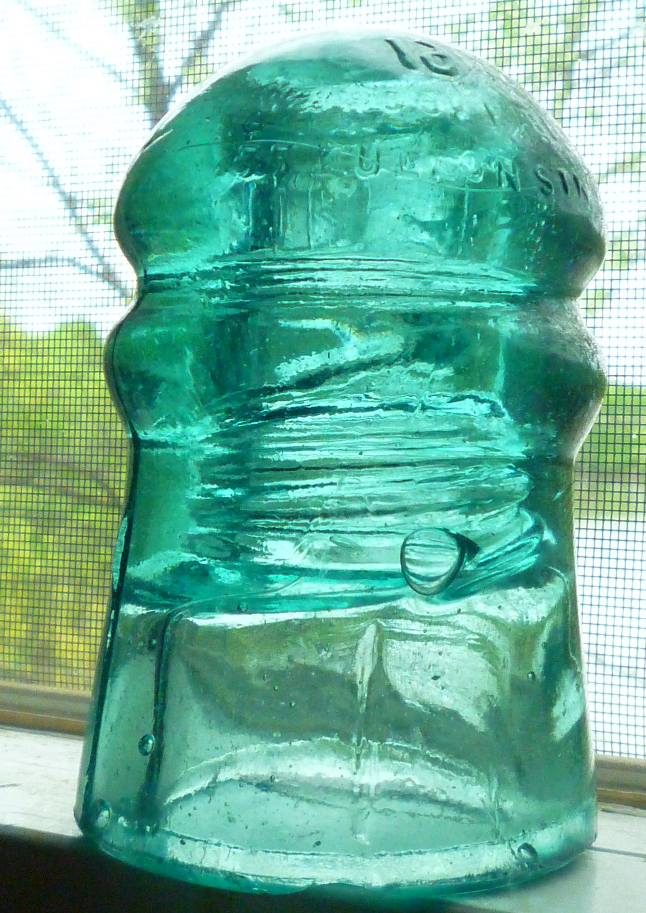 CD 126 W. BROOKIFIELD blobtop telegraph insulator. Front crown embossed: 16 / W. BROOKFIELD / 55 FULTON ST. N.Y. {NOTE THAT THE " 1 " IS NORMAL, BUT THE " 6 " IS BACKWARDS AND ENGRAVED A LITTLE HIGHER} Rear crown embossed: PAT. FEB 22ND 1870 / JAN 25 1870 / JAN 14TH 1879 Note that on the inside of the front skirt is a 1-1/2 inch vertical bar. Probably a machine cut on the threading mandrel. Nice small bubble above that as well. Smooth base AQUA glass MOLD LINE OVER DOME Small amount of micro fizzy bubbles Stock #a3961 $10.00 + shipping |
