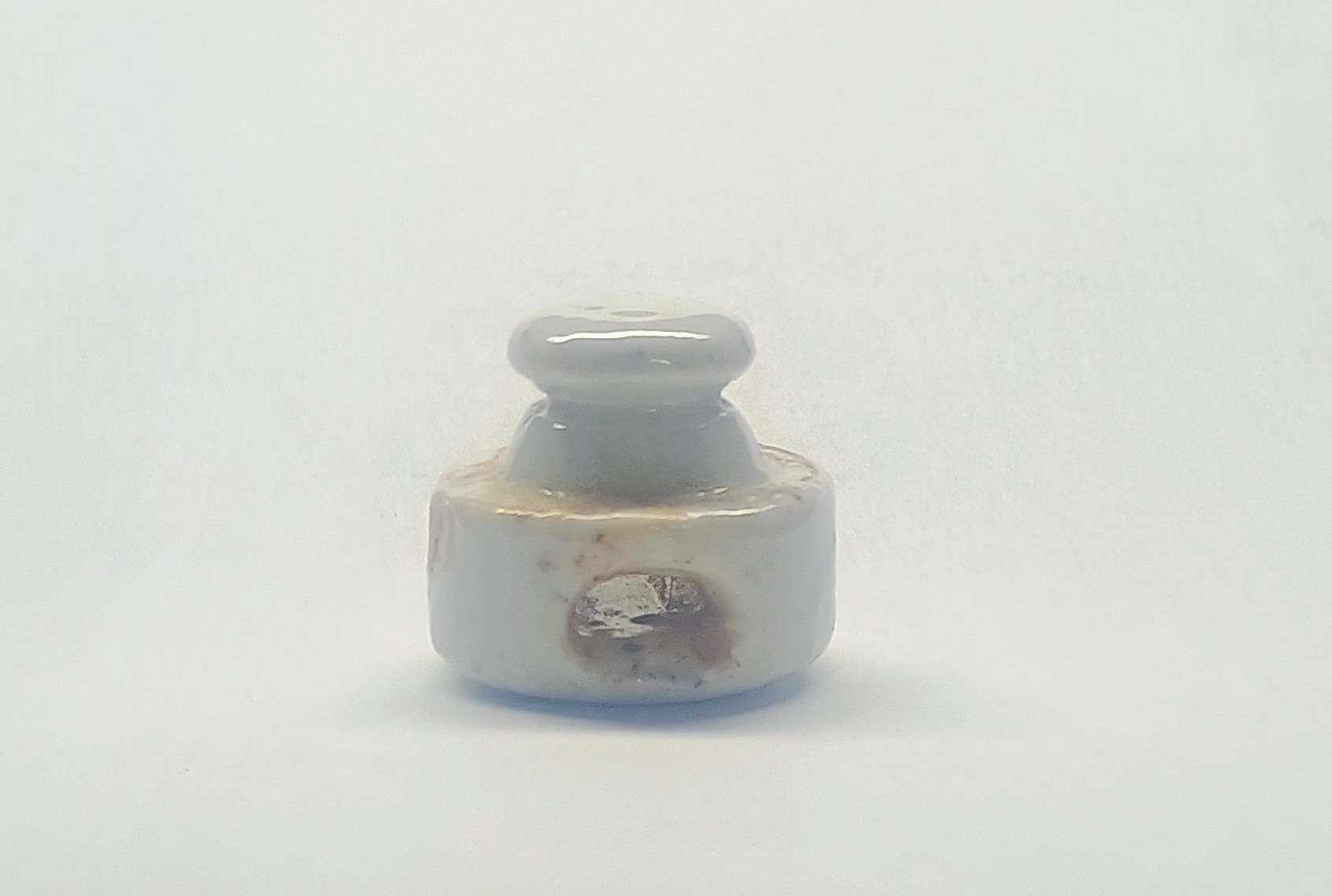 White glazed porcelain and appears to be strapped to its intended surface. Measurements are 1 1/16" wide at the base X 1" tall. Is this some sort of electric fence insulator?