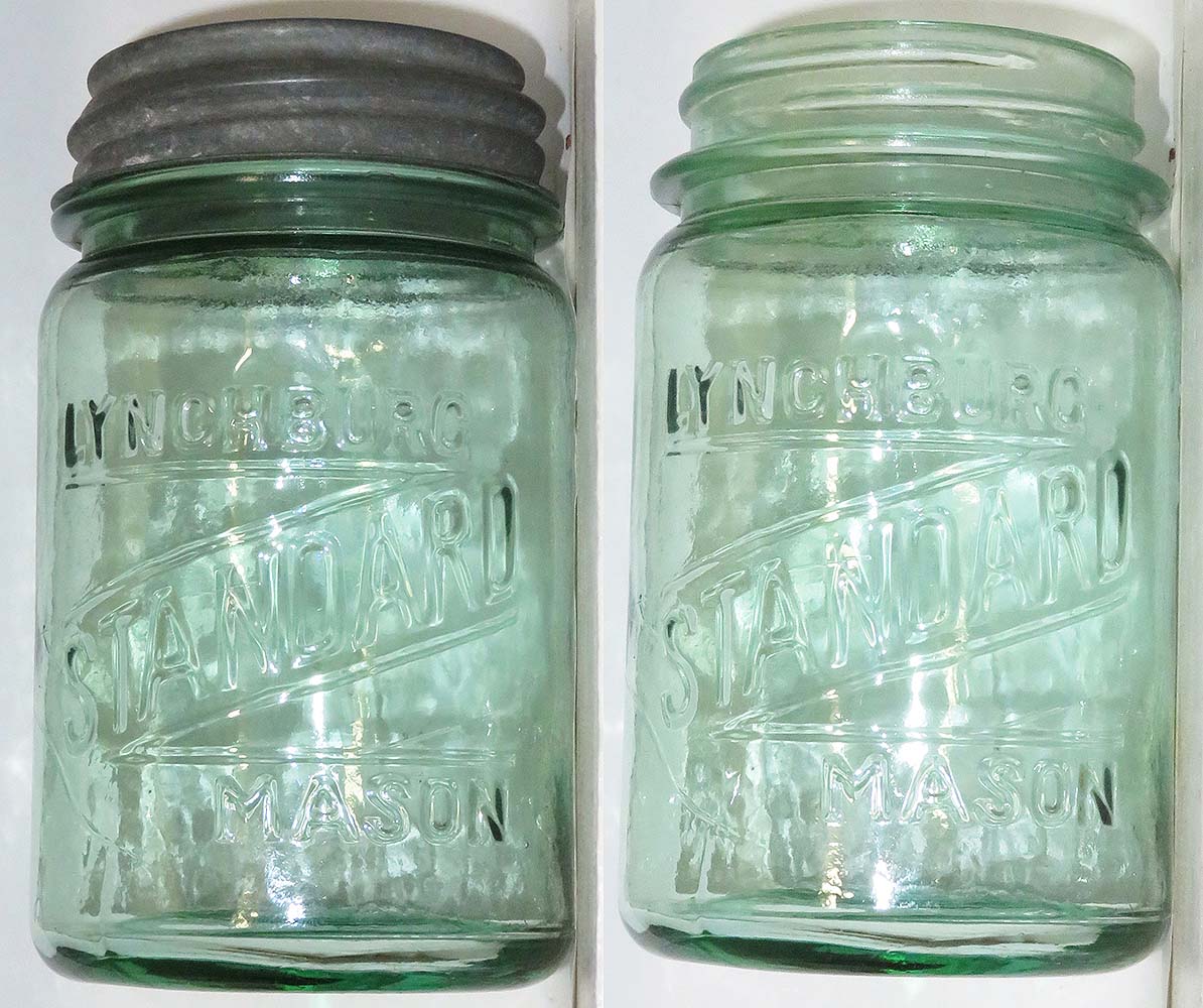 I'm not a fruit jar expert, but I believe this is a pint size jar (5 1/4" tall and 3 1/8" wide) being a nice size for display! Marked LYNCHBURG / STANDARD / MASON - comes with a zinc lid with a milk glass insert -- nice condition and in a nice light green / sage green shade. $100 plus actual postage NOTE: I'm selling these insulators on behalf of the Jim Fielding estate -- PayPal (no fee friends and family) or checks are both accepted - I'll provide instructions. I'll also be handling all the packing and mailing. |