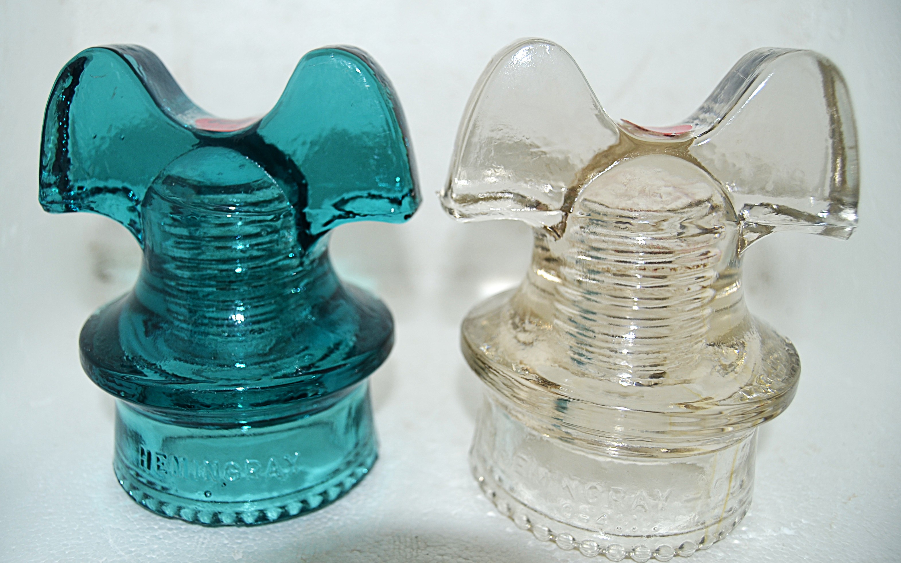 Left is a nice Hemingray Blue embossed Hemingray and on back No 60 - Sharp drips - One very small area that is rough on bottom of left ear. $90 Right embossed Hemingray with dots - Rear Made in U.S.A. 5 - round drips - clear with a little straw - See no flaws - $35 - I will pay 1/2 of shipping costs. |