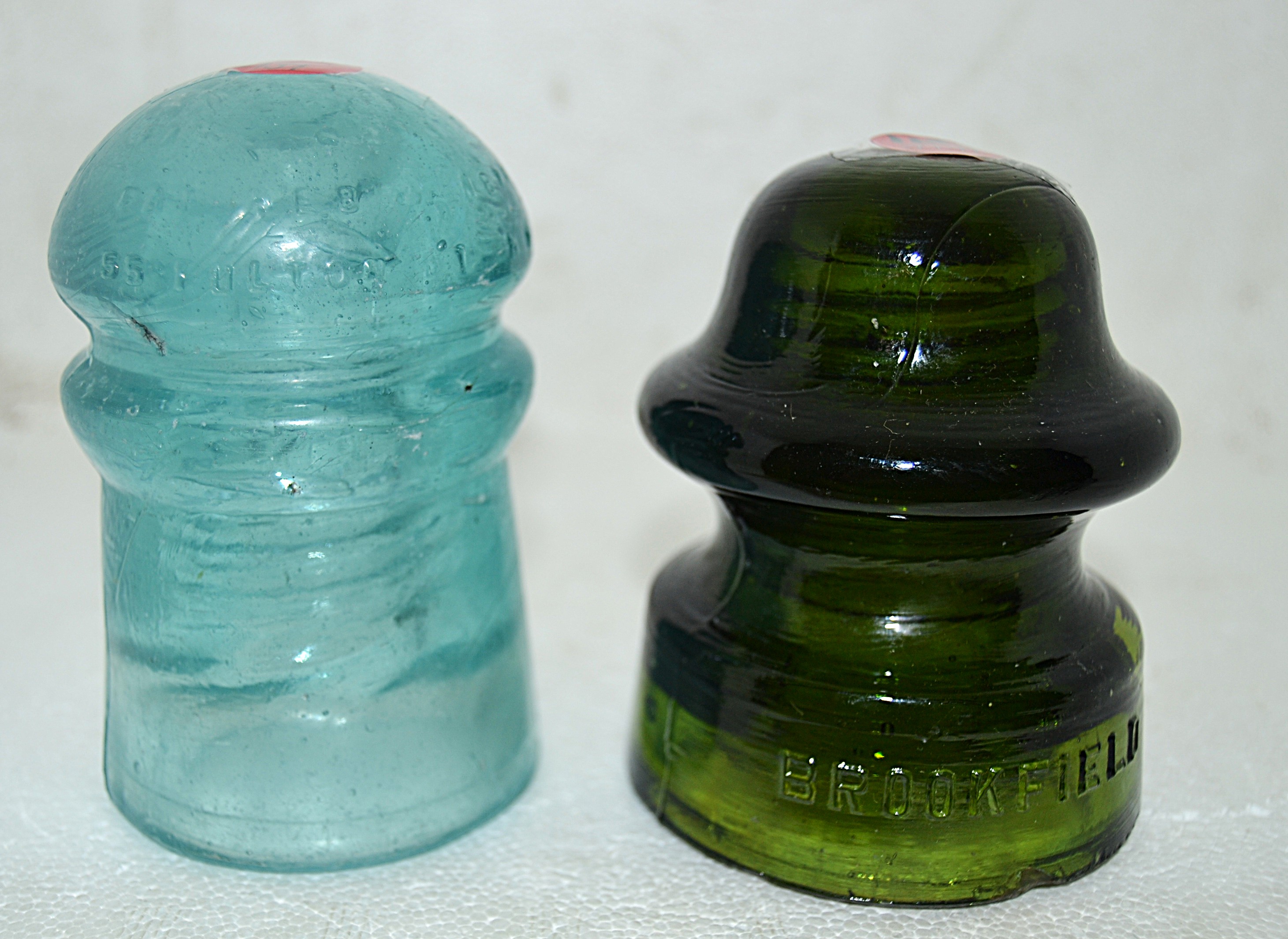 Right is a CD 164 embossed Brookfield and on back No. 28 - Yellowish olive green - Smooth base - Slight sliver on front $100 Left embossed on crown Pat March 20 1870 W. Brookfield with a 11 - opposite side Pat Jan 25 1870 Pat Feb 22 1870 55 Fulton St. N.Y. Blue aqua with lots of Micro air bubbles - Few scratches around - $18 plus shipping. |