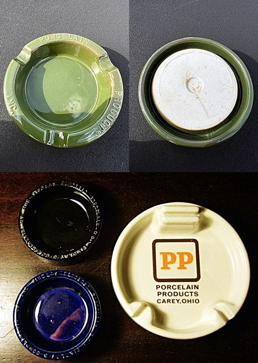 Hello All, I used to smoke but since being in the hospital and that it may have contributed to my bad cellulitous in my legs I quit for good. Well maybe a cigar on a special occasion. Come on. Recently I came across a couple of neat advertising ashtrays that went with the insulator companies I am collecting. The top picture is of a really cool early Porcelain Products Inc. ashtray in rare green glaze. The glaze matches pefectly with the green glaze pintypes I have. It's about 3" in diameter. The bottom photo shows a more modern PP ashtray with two Findlay Electric Porcelain Co. ashtrays I have. They also match Findlay cobalt blue and muddy chocolate brown pieces in my collection. Both of them are 3" in diameter also. Back in the day, smoking was a big thing and a good advertising product was ashtrays and matchbooks. So glad to have saved these pieces of history. |