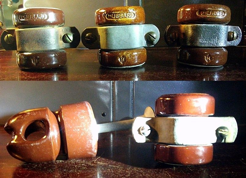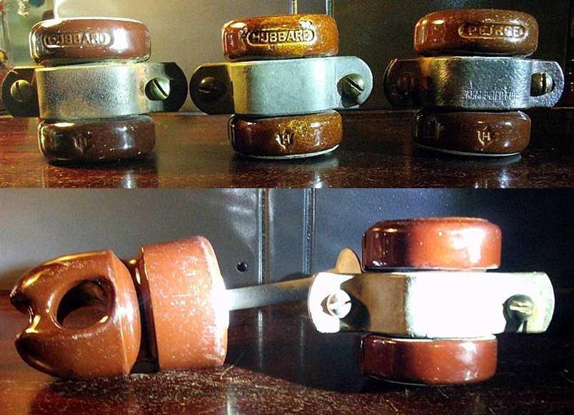 Here is some more Duplex Streetlight insulators in my collection. The top picture is of two Hubbard and one Pierce split knob style made by Hubbard & Company. The Peirce one is also marked PAT APPLIED FOR on the metal front. They had a patent US 1,788,245 1/6/1931 for these. The bottom picture is of two different pieces made by Seyler Mfg. and Construction Co. They both have an embossed S on the metal shank of the insulator. Seyler was a distributer for Locke Insulator Co. and their own brand. Locke probably made the porcelain parts for Seyler. I have many Seyler, Locke and General Electric wire holders and spools that share the same shapes and catalog numbers. |