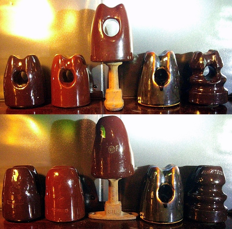 More of the neat streetlight insulators I have. This group is made by Line Material Co. and is a copy of the Locke U-339C dead end insulator. Most are marked with the LM in a triangle symbol and PAT PEND. One piece I have is ink marked LM symbol /F/ Patent No. 1,709,477 which refers to their lag screw patent. Some pieces also have a WP which stands for Wet Process. The 4th piece in is unmarked but I aquired it in a lot of Hartford Faience pieces I got years ago. I'm assuming it was made for Line Material by them. The last piece is a dump item marked Findlay 1933. This catalog number was later used for P.P. Inc's little mighty midget wire holder insulator. I can see why this was a dump item but it;s also the only one I have seen. I have yet to find out what the other markings on Line Material Co. insulators such as F, H, squigily line and circle with a line through it mean. If anybody has any info on them would love to hear it. |