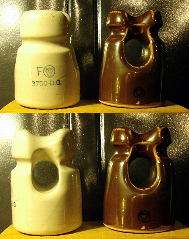 These two pieces were made for the Canadian Line Material Co. The white one is ink marked F/LM symbol and 3750-D.G. catalog number. The second is a earlier piece just marked with a triangle in a circle. These are definatly heavy duty pieces., I would love to find a CLM catalog or a Canadian Ohio Brass Co. catalog for that matter. It is hard enough to find catalogs for U.S. manufacturers but even harder for foreign countries. Thanks to all those foreign insulator collectors who post and provide info. We all greatly appreciate it. |