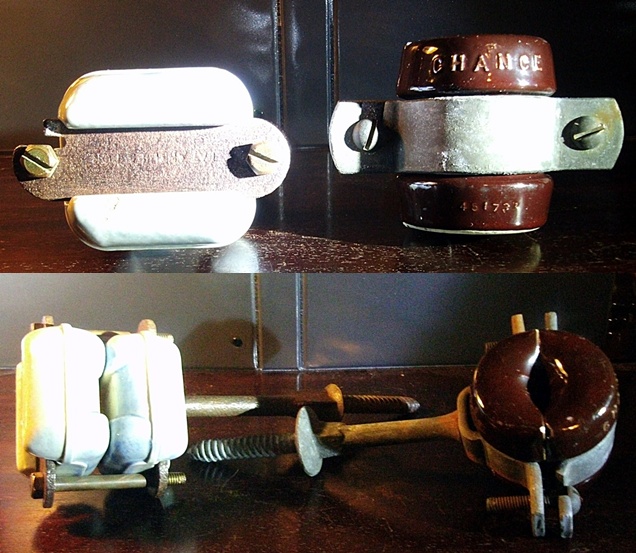 This picture shows the Chance piece I mentioned earlier plus a pretty light blue piece marked PAT APPLIED FOR on the metal front. This is a weird special design and I assume it was made for Hubbard & Co. due to the glaze color being the same as Peirce spool insulators I have. Also the Pat Applied For letters are the same as ones on another Pierce piece I have.. I wish I could find a catalog showing this piece to verify who made it. Neat anyways. |